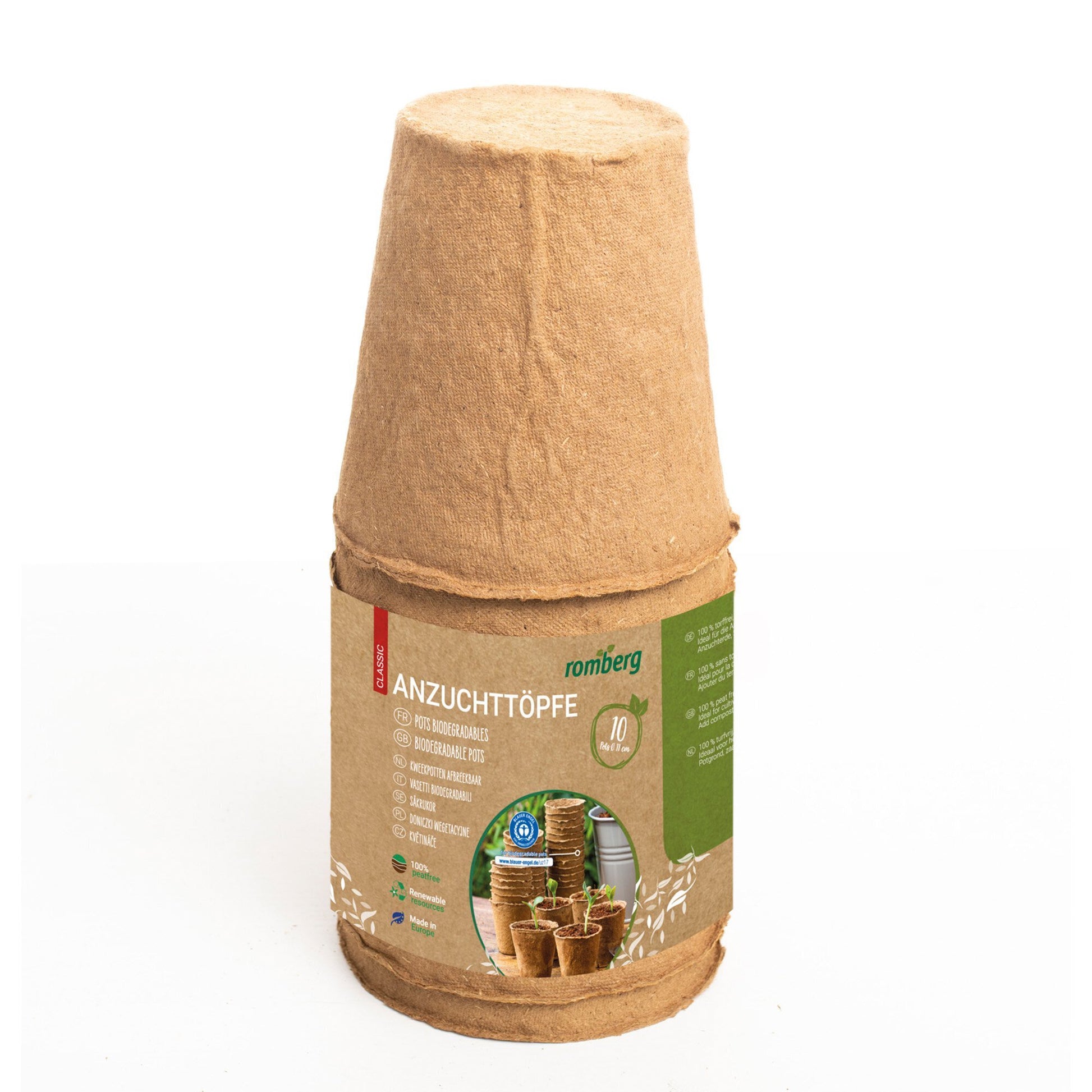 Romberg Anzuchttöpfe sind 100% torffrei und aus Zellulose hergestellt. Sie eigenen sich insbesondere für den Einsatz in Zimmergewächshäusern. Die Töpfe ermöglichen eine leichte Durchwurzelung. Es entsteht kein Umpflanzschock, da die Jungpflanzen mit dem Topf ausgepflanzt werden. Nach dem Auspflanzen zersetzt sich der Anzuchttopf biologisch. Die Töpfe eignen sich für die Vermehrung durch Samen, zum Pikieren kleiner Sämlinge und für die Anzucht von Stecklingen. Zunächst sind die Töpfe bis ca. 0,5 cm unter den Rand mit Anzuchterde zu füllen. Danach werden je nach Pflanzenart ein oder mehrere Samen auf die Substratoberfläche gestreut und mit etwas Substrat abgedeckt. Nachfolgend Erde befeuchten. Alle Romberg Anzuchttöpfe sind mit den Umweltsiegeln „Der Blaue Engel“ und "PEFC" gekennzeichnet, welche für eine besonders umweltfreundliche und ressourcenschonende Herstellung stehen.