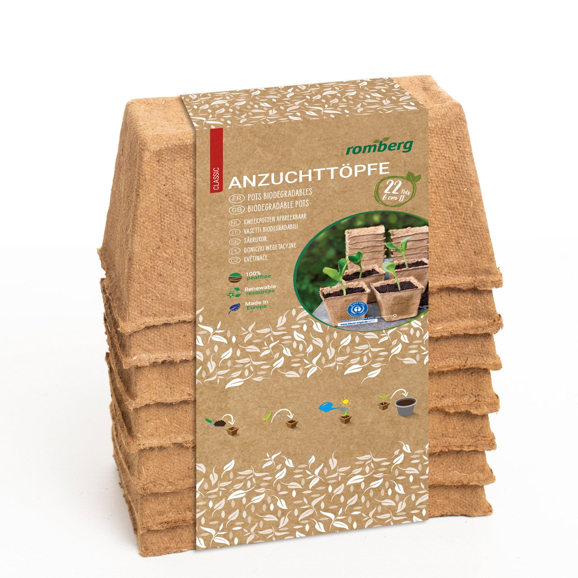 Romberg Anzuchttöpfe sind 100% torffrei und aus Zellulose hergestellt. Sie eigenen sich insbesondere für den Einsatz in Zimmergewächshäusern. Die Töpfe ermöglichen eine leichte Durchwurzelung. Es entsteht kein Umpflanzschock, da die Jungpflanzen mit dem Topf ausgepflanzt werden. Nach dem Auspflanzen zersetzt sich der Anzuchttopf biologisch. Die Töpfe eignen sich für die Vermehrung durch Samen, zum Pikieren kleiner Sämlinge und für die Anzucht von Stecklingen. Zunächst sind die Töpfe bis ca. 0,5 cm unter den Rand mit Anzuchterde zu füllen. Danach werden je nach Pflanzenart ein oder mehrere Samen auf die Substratoberfläche gestreut und mit etwas Substrat abgedeckt. Nachfolgend Erde befeuchten. Alle Romberg Anzuchttöpfe sind mit den Umweltsiegeln „Der Blaue Engel“ und "PEFC" gekennzeichnet, welche für eine besonders umweltfreundliche und ressourcenschonende Herstellung stehen.
