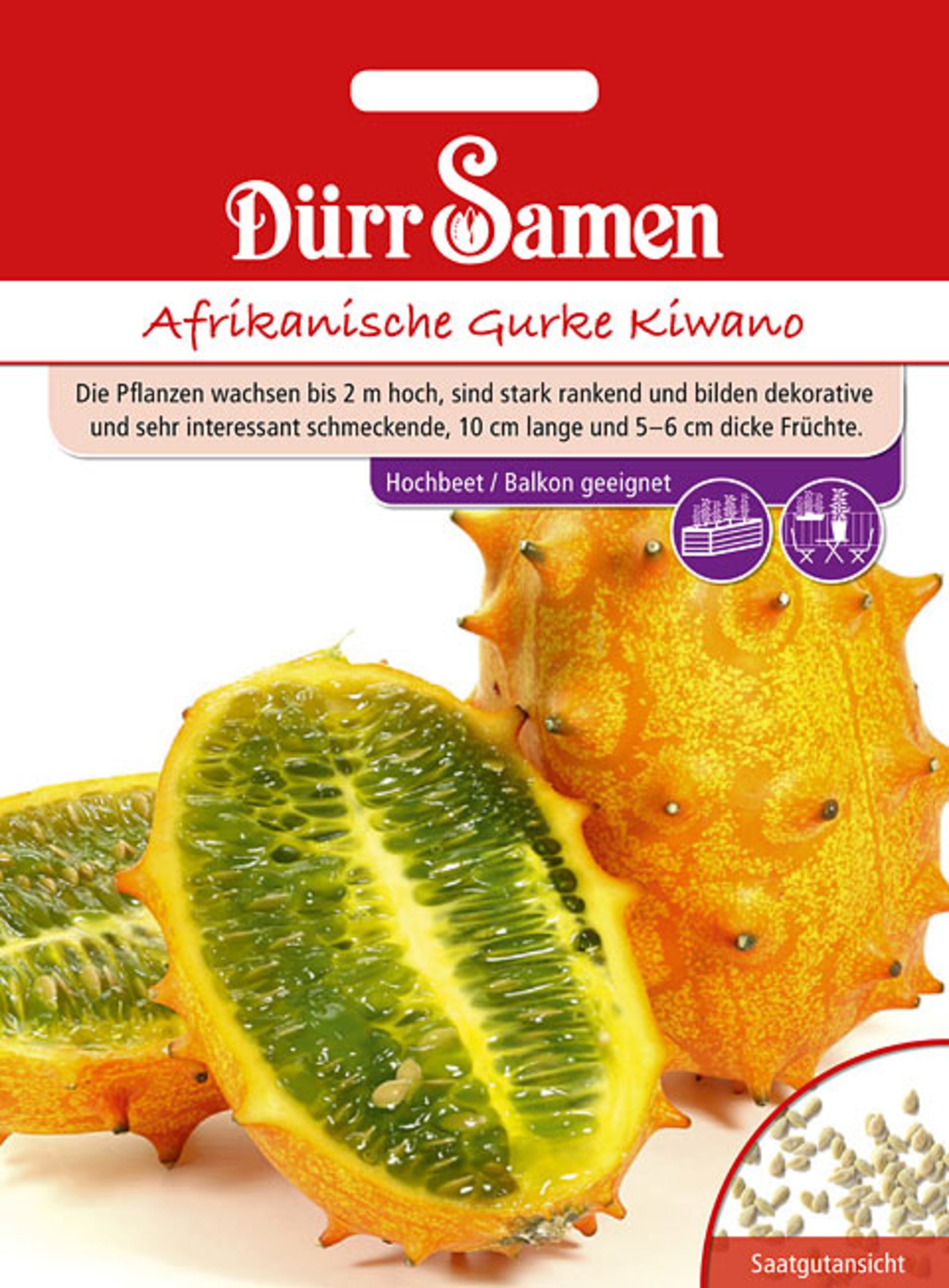 Info: Die Pflanzen wachsen bis 2 m hoch, sind stark rankend und bilden dekorative und sehr interessant schmeckende, 10 cm lange und 5–6 cm dicke Früchte.