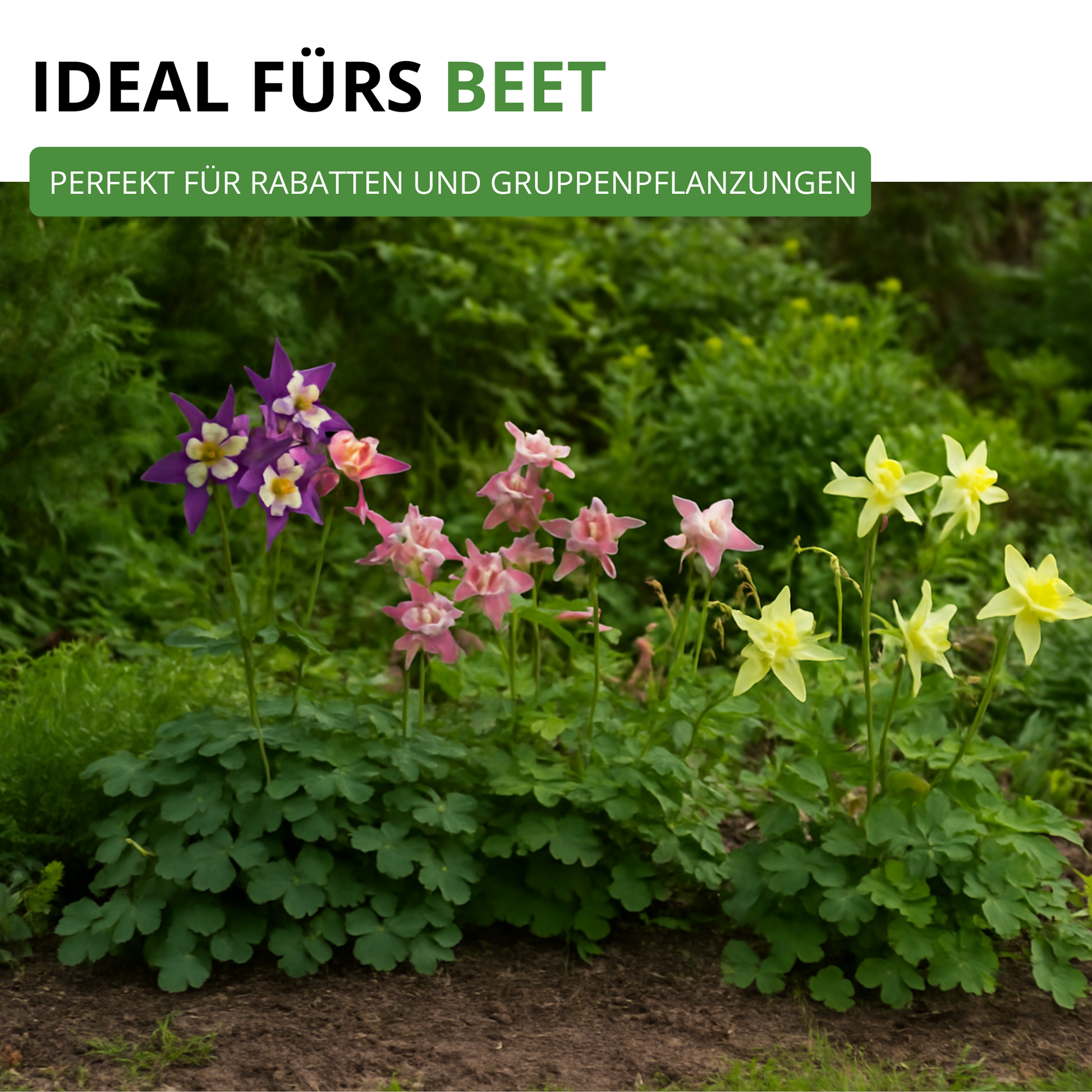 Farbenfroher, mehrjähriger Stauden-Mix mit zarten, elegant geformten Blüten in Rosa-, Blau-, Gelb- und Weißtönen. Eignet sich hervorragend für naturnahe Gärten, Beete und als Schnittblumen.