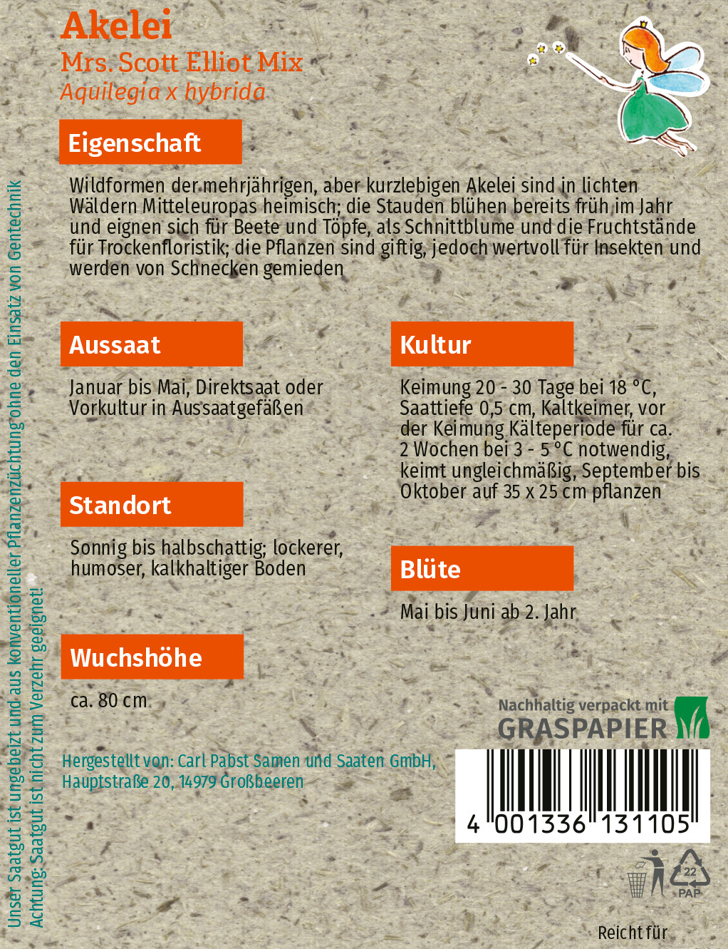 Wildformen der mehrjährigen, aber kurzlebigen Akelei sind in lichten Wäldern Mitteleuropas heimisch. Die Stauden blühen bereits früh im Jahr und eignen sich für Beete und Töpfe, als Schnittblumen und die Fruchtstände für Trockenfloristik. Die Pflanzen sind giftig, jedoch wertvoll für Insekten und werden von Schnecken gemieden.