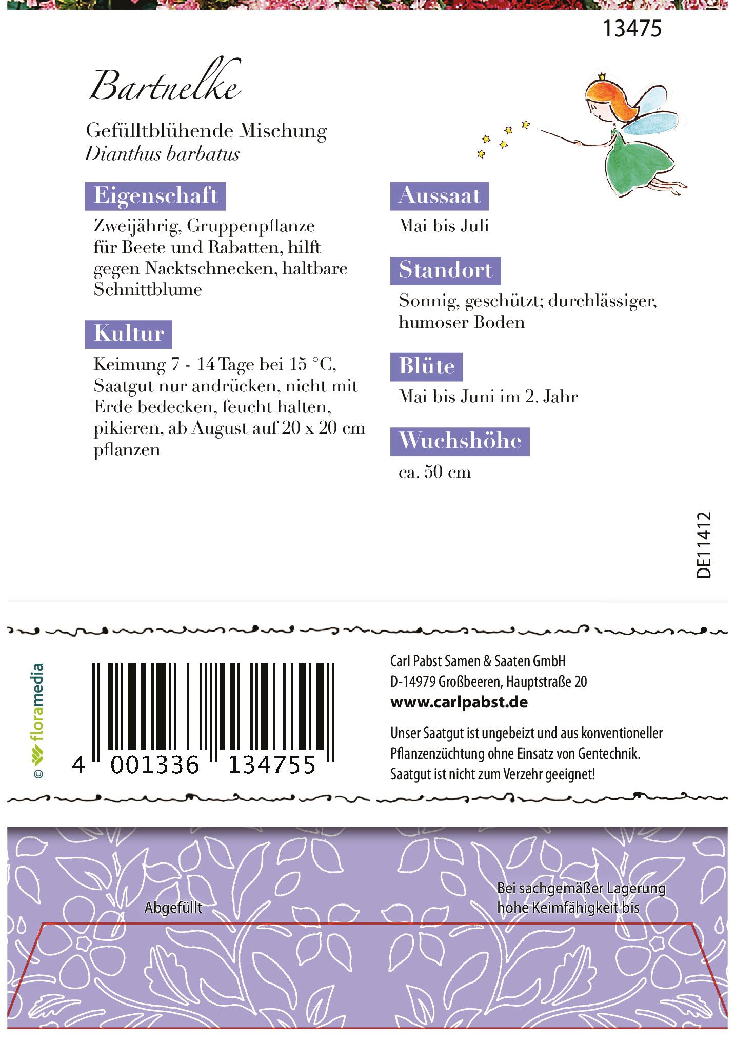 Anspruchslose, zweijährige Gruppenpflanzen mit bartähnlichen Kelchblättern unterhalb der prachtvollen, gefüllten, duftenden Blüten. Bartnelken sind beliebte Bauerngartenpflanzen und haltbare Schnittblumen, Dauerblüher für Beete und Rabatten, aber auch für Kübel geeignet. Von Schnecken werden sie gemieden.