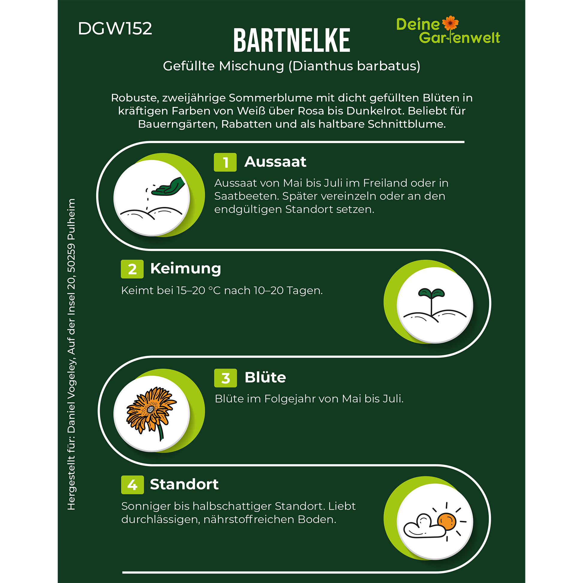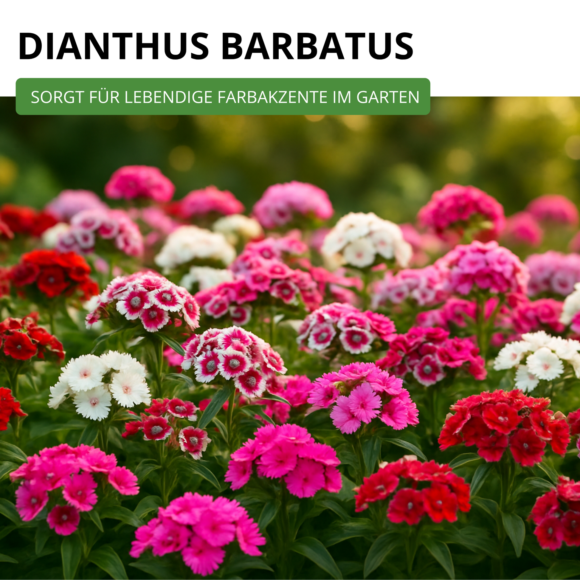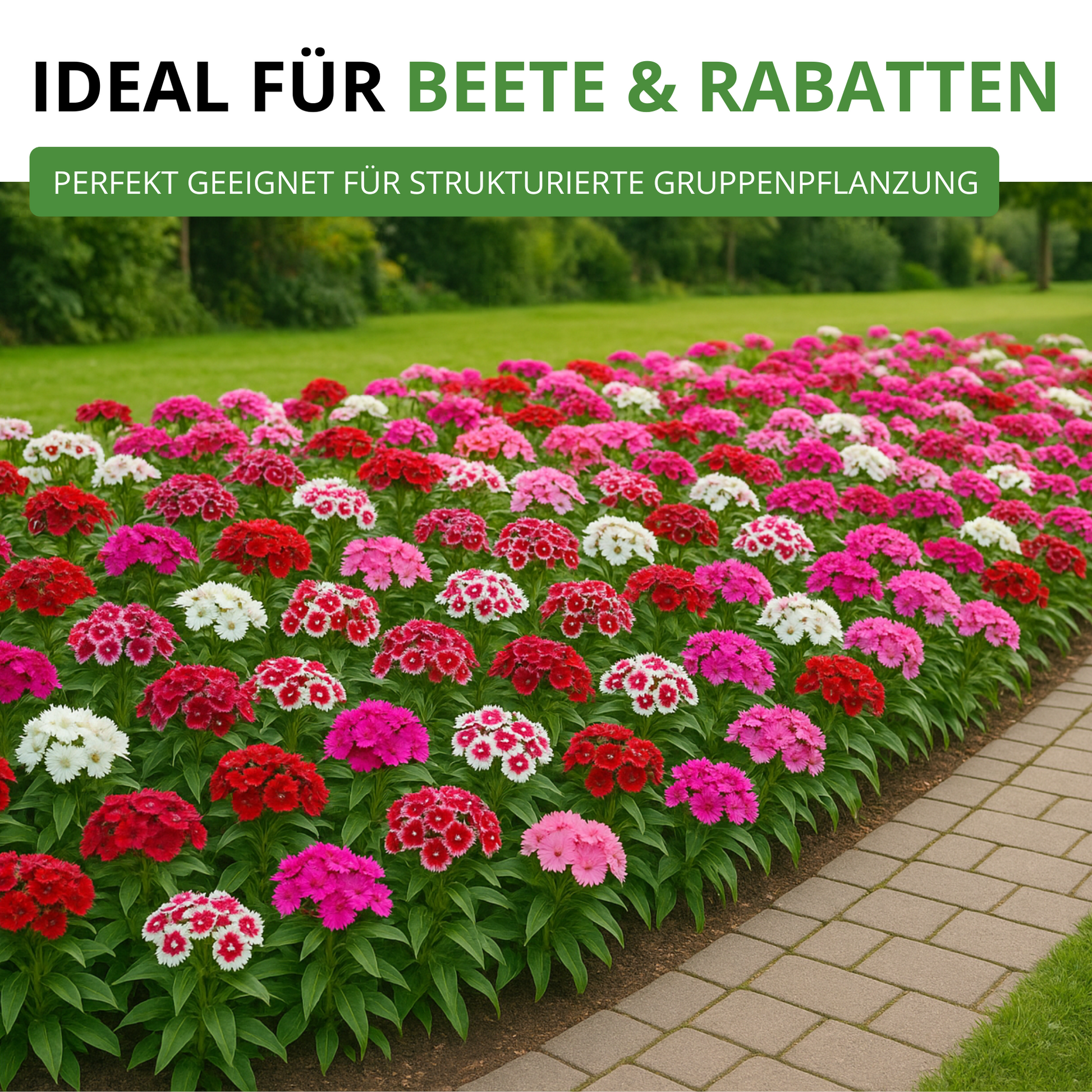 Robuste, zweijährige Sommerblume mit dicht gefüllten Blüten in kräftigen Farben von Weiß über Rosa bis Dunkelrot. Beliebt für Bauerngärten, Rabatten und als haltbare Schnittblume.