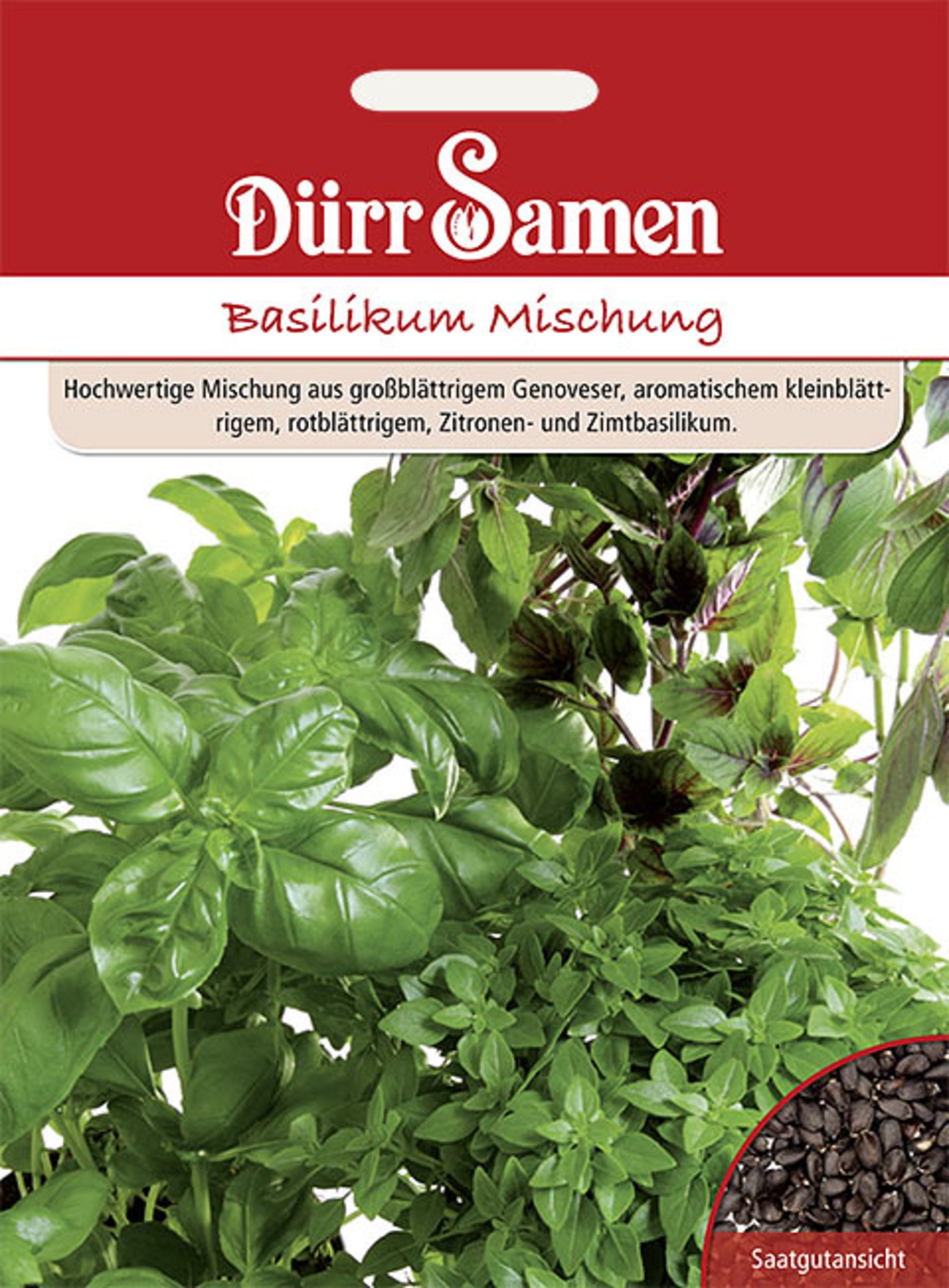 Info: Eine sehr hochwertige Mischung aus großblättrigem Genoveser, aromatischem kleinblättrigem, rotblättrigem, Zitronen- und Zimtbasilikum. Für die Fensterbank, Balkon oder Freiland.