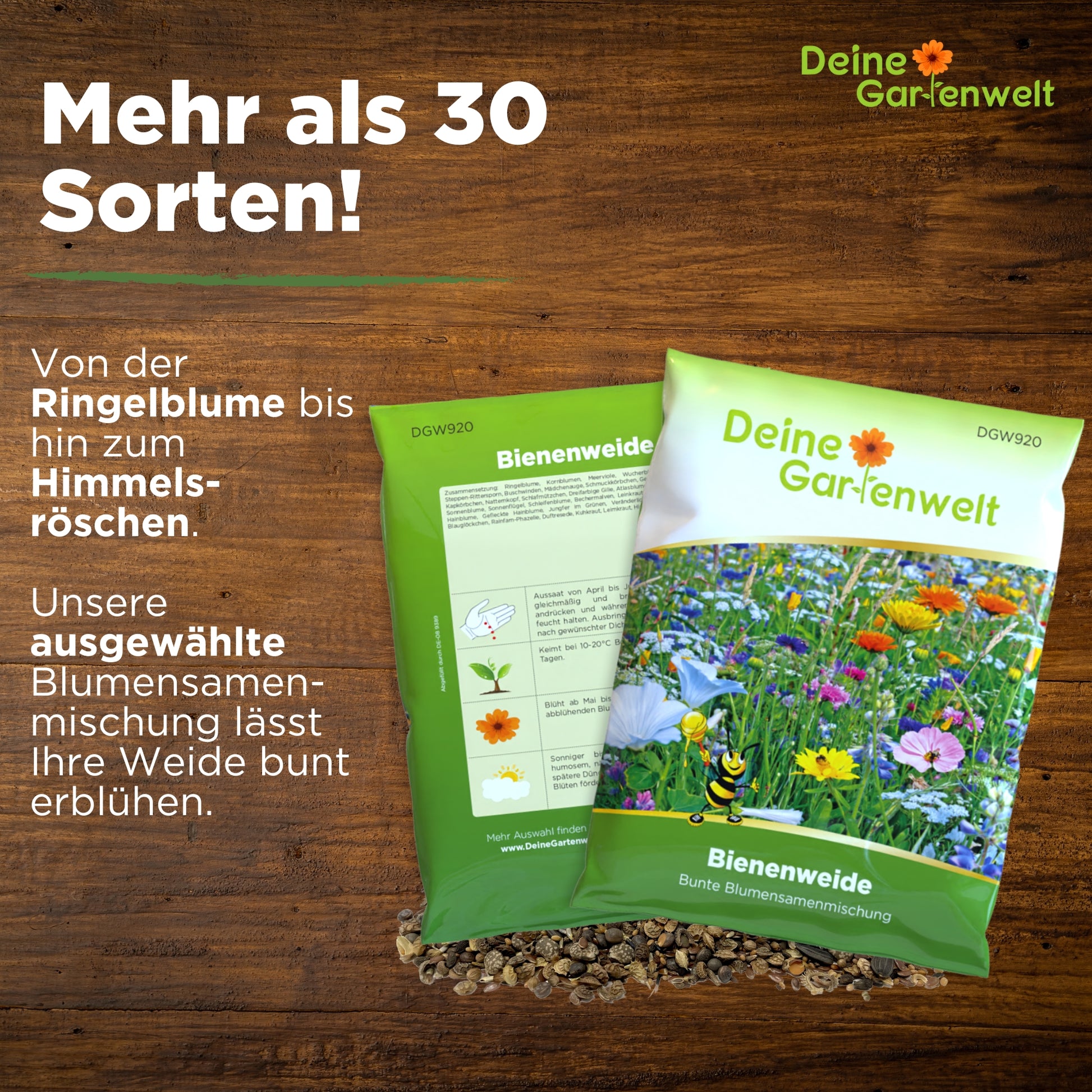 Zusammensetzung: Ringelblume, Kornblumen, Meerviole, Wucherblume, Mandelröschen, Steppen-Rittersporn, Buschwinden, Mädchenauge, Schmuckkörbchen, Gelbes Schmuckkörbchen, Kapkörbchen, Natternkopf, Schlafmützchen, Dreifarbige Gilie, Atlasblume, Sommer-Schleierkraut, Sonnenblume, Sonnenflügel, Schleifenblume, Bechermalven, Leinkraut, Blauer Lein, Roter Lein, Hainblume, Gefleckte Hainblume, Jungfer im Grünen, Veränderlicher Mohn, Klatschmohn, Blauglöckchen, Rainfarn-Phazelie, Duftresede, Kuhkraut, Leimkraut, Himmelsröschen