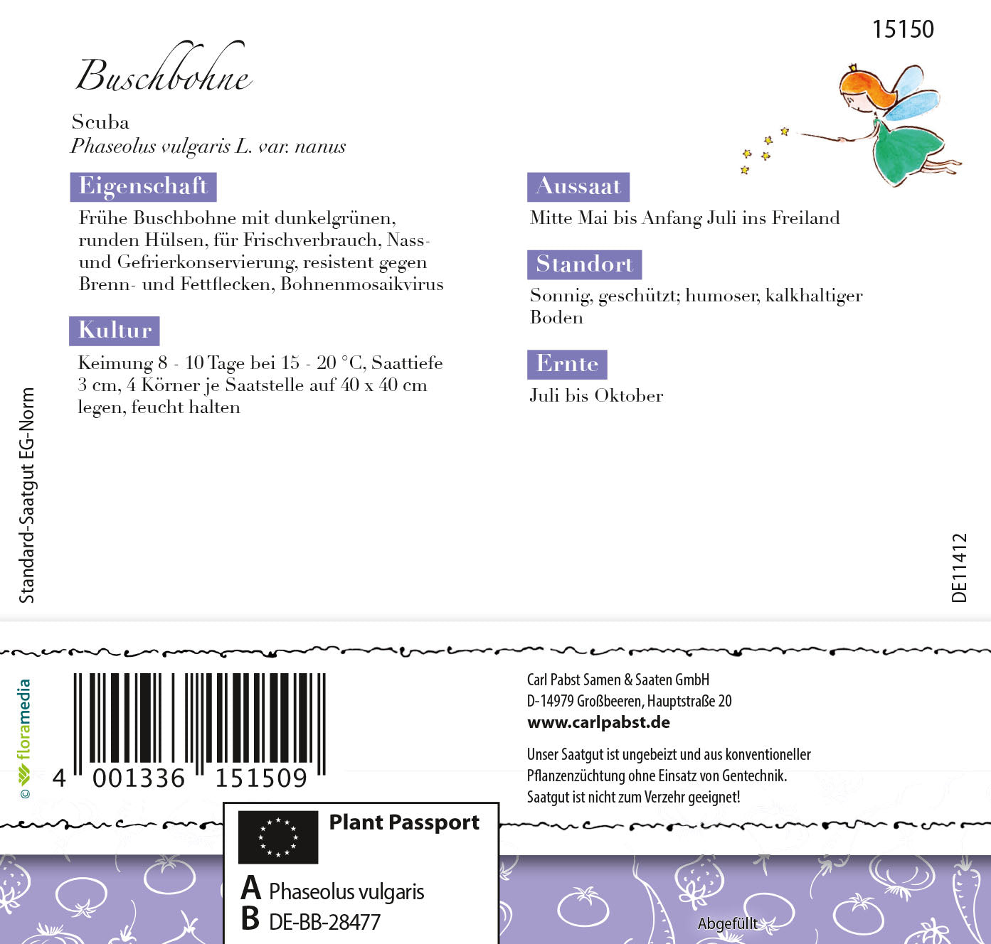 Standfeste, widerstandsfähige Buschbohne mit sehr schmackhaften, dunkelgrünen, geraden, fadenlosen, zarten Hülsen, die man frisch genießen, aber auch einwecken, besonders gut einfrieren und über einen langen Zeitraum ernten kann, resistent gegen Brenn- und Fettflecken sowie Bohnenmosaikvirus, Achtung: Rohe Bohnen sind giftig!