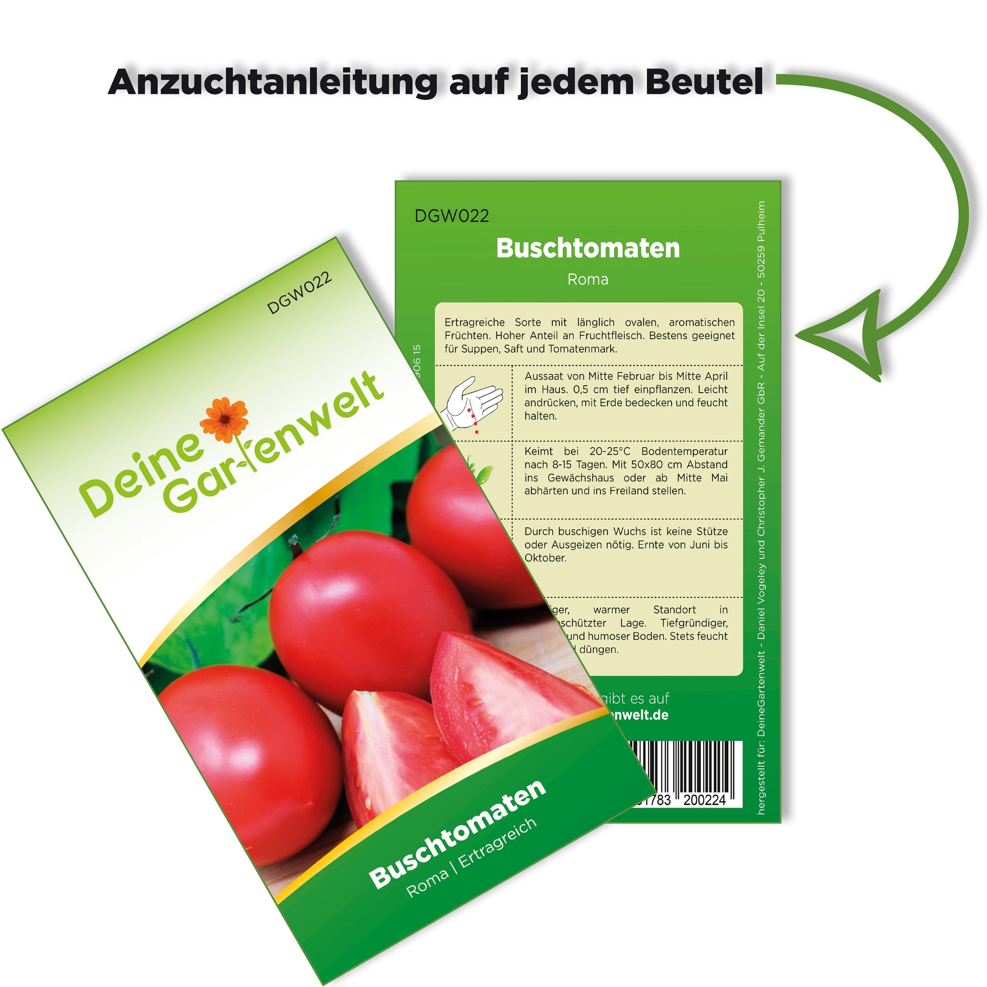 Ernte: Durch buschigen Wuchs ist keine Stütze oder Ausgeizen nötig. Ernte von Juni bis Oktober.