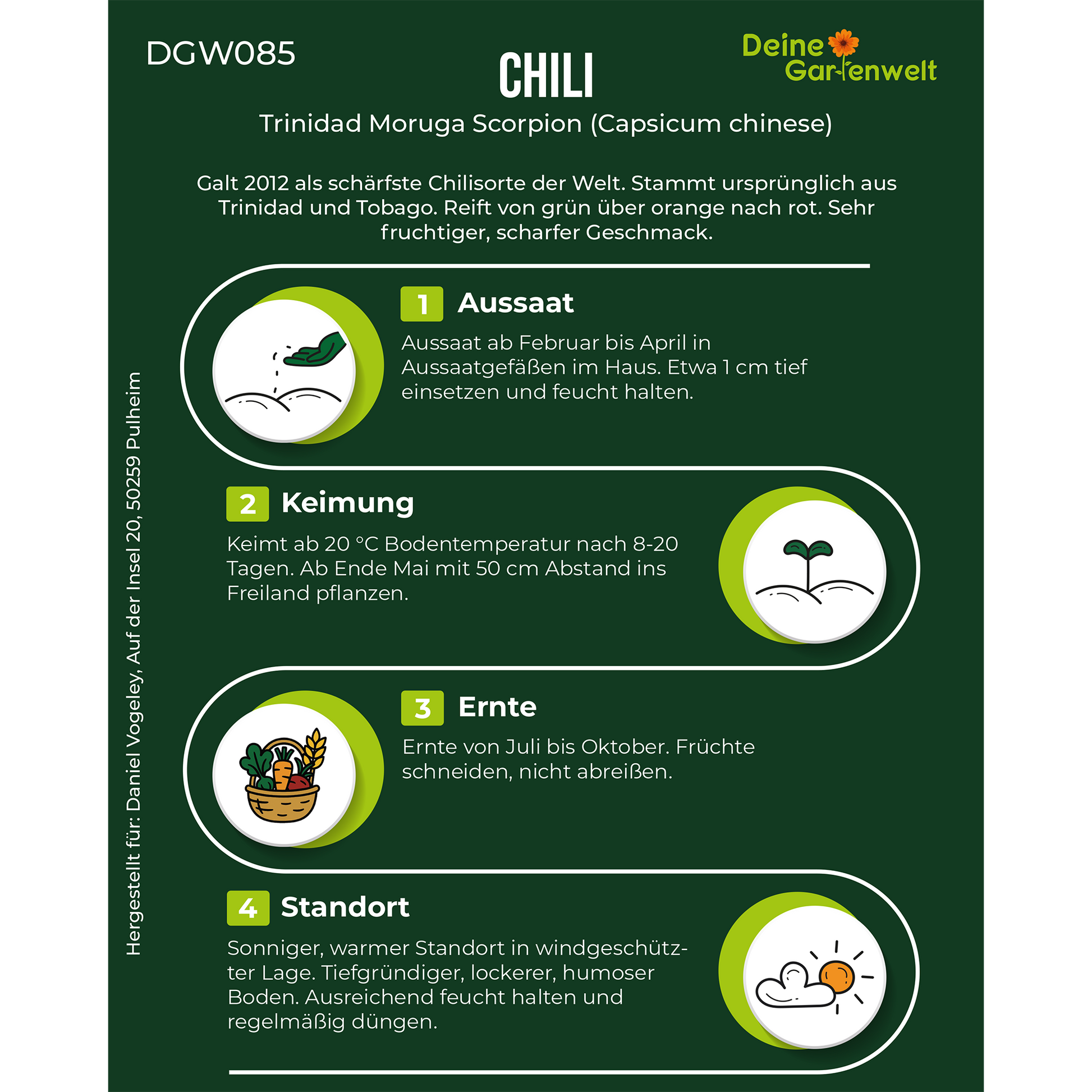Galt 2012 als schärfste Chilisorte der Welt. Stammt ursprünglich aus Trinidad und Tobago. Reift von grün über orange nach rot. Sehr fruchtiger, scharfer Geschmack.