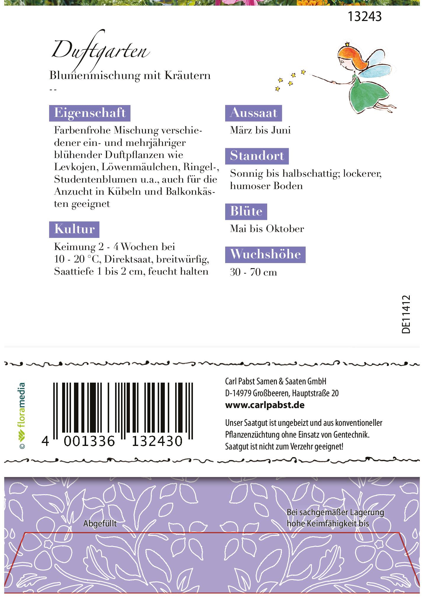 Farbenfrohe Mischung verschiedener ein- und mehrjähriger, blühender Duftpflanzen. Sie kann in Beeten, aber auch an freien Stellen in Rabatten, in Kübeln und Balkonkästen ausgesät werden. Die enthaltenen Arten wie Levkojen, Löwenmäulchen, Ringel- und Studentenblumen, Drachenkopf u.a. sind auch für Insekten attraktiv.
