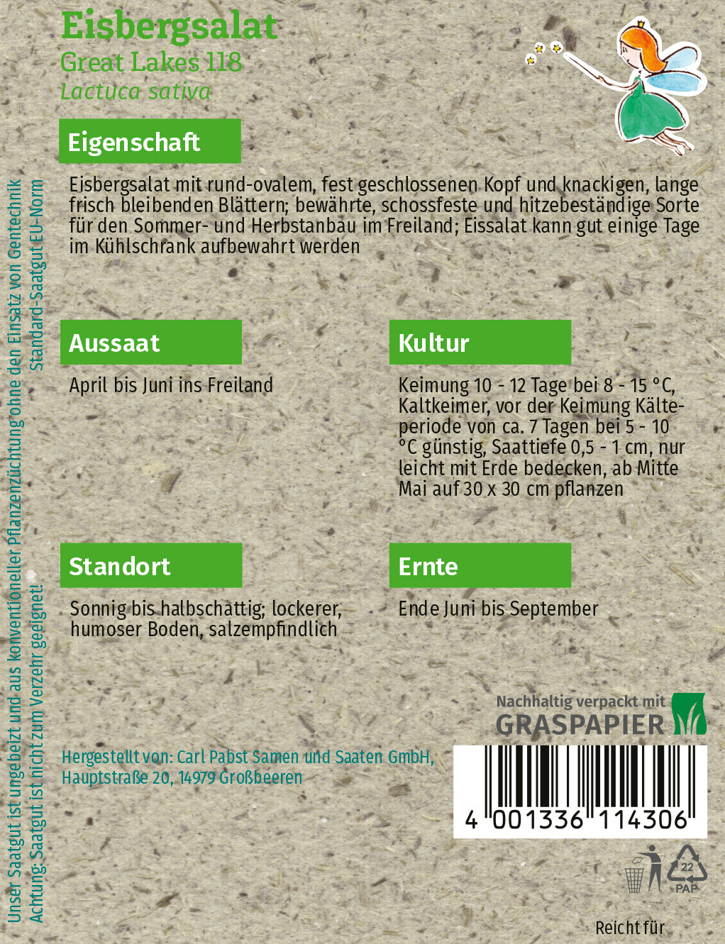 Eisbergsalat mit rund-ovalem, fest geschlossenen Kopf und knackigen, lange frisch bleibenden Blättern. Eine bewährte, schossfeste und hitzebeständige Sorte für den Sommer- und Herbstanbau im Freilan. Eissalat kann gut einige Tage im Kühlschrank aufbewahrt werden.