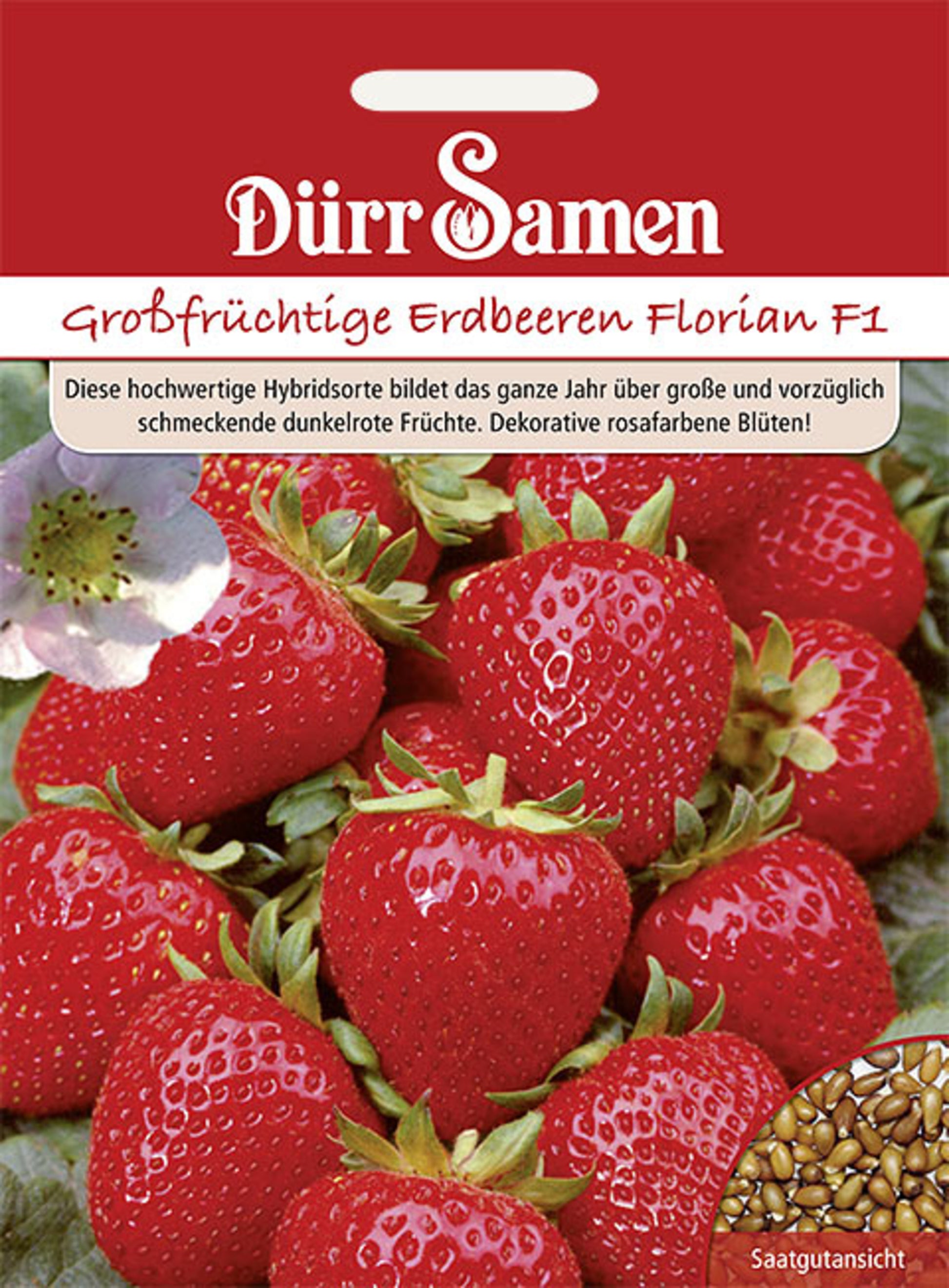 Info: Erdbeeren Florian F1, eine hochwertige Hybridsorte, bildet das ganze Jahr über große und vorzüglich schmeckende dunkelrote Früchte. Dekorative rosafarbene Blüten!