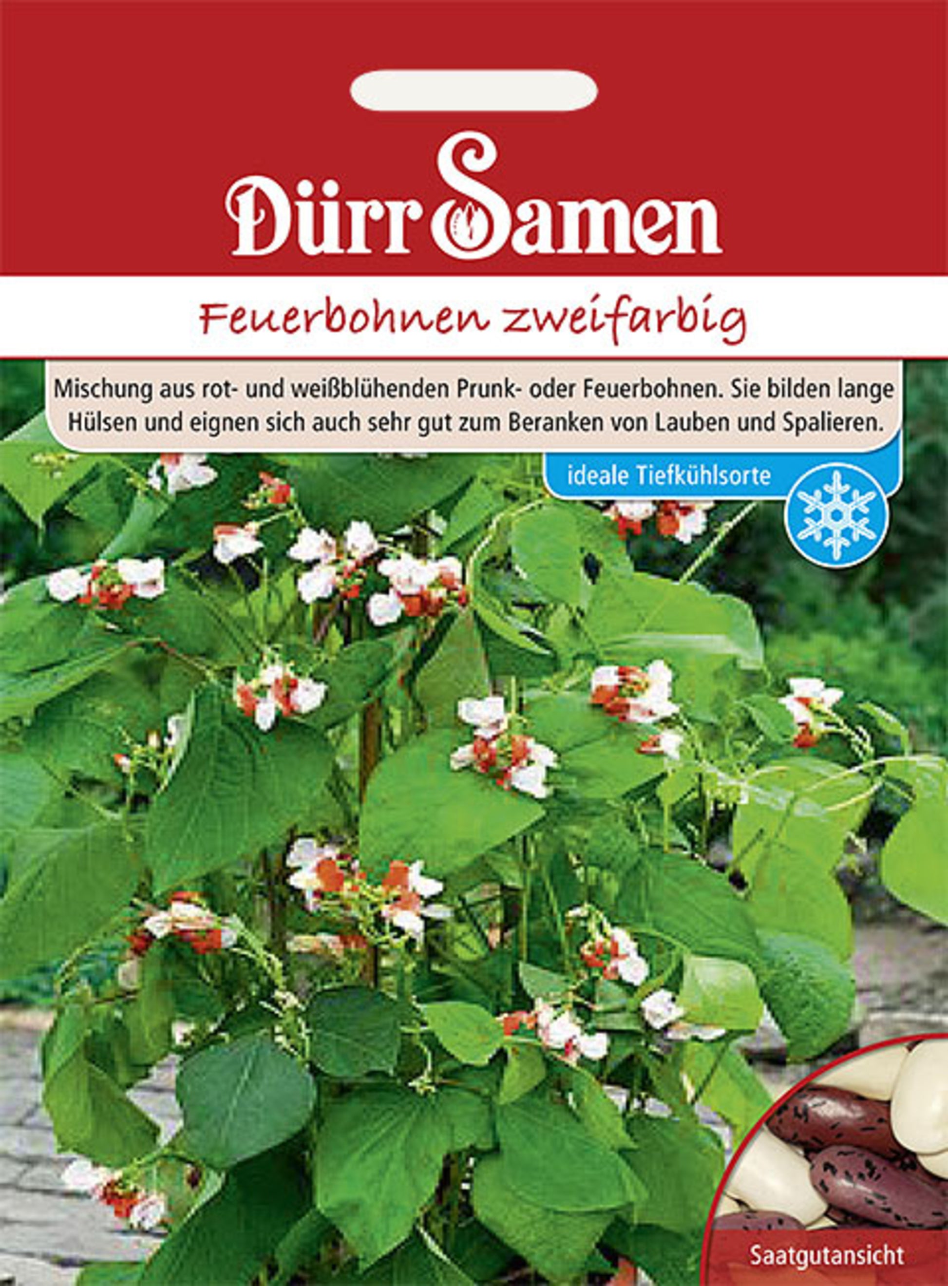 Info: Diese Mischung aus rot- und weißblühenden Prunk- oder Feuerbohnen bilden sehr lange, fleischige Hülsen und sind sehr ertragreich. Sie eignen sich auch vorzüglich zum Beranken von Lauben und Spalieren.