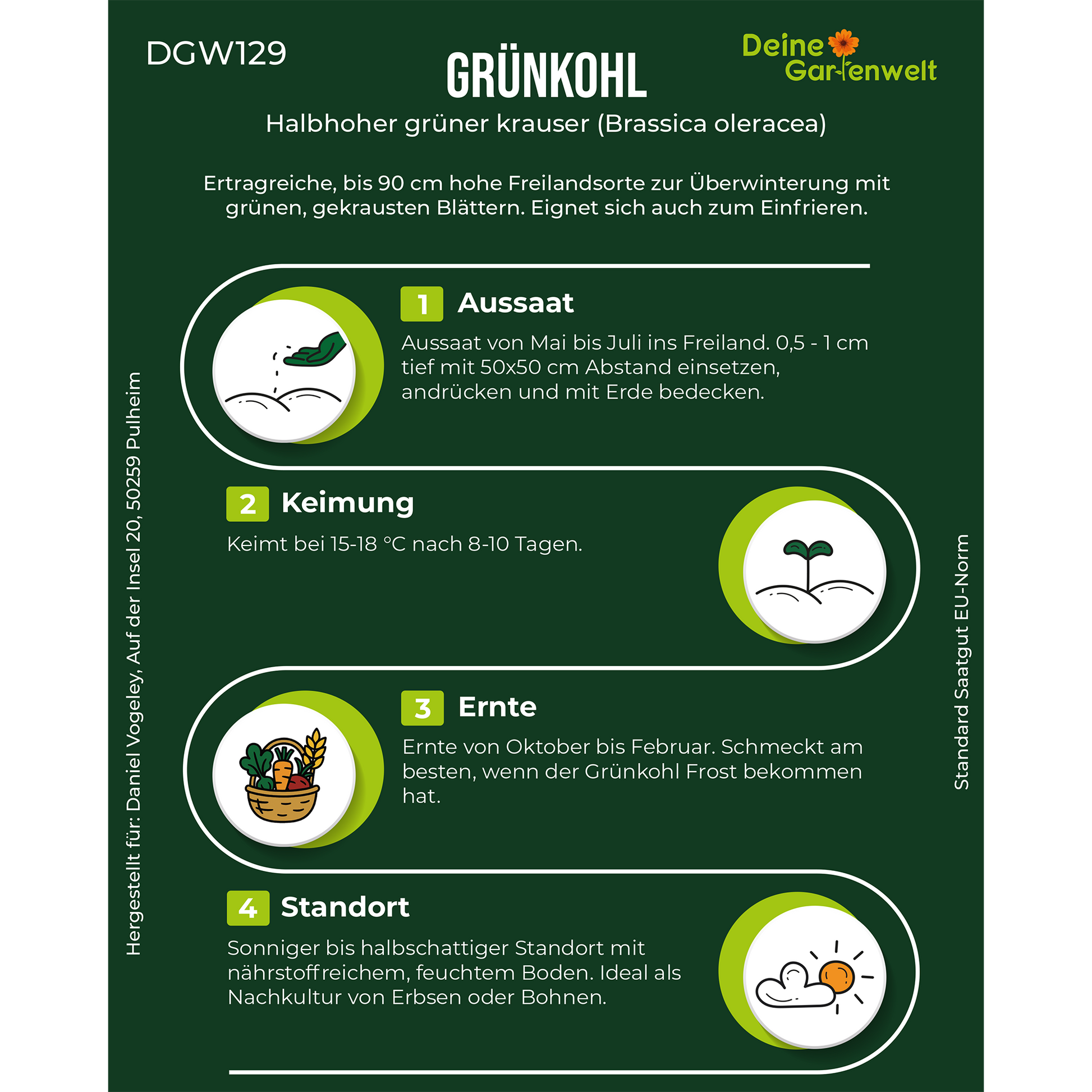 Ertragreiche, bis 90 cm hohe Freilandsorte zur Überwinterung mit grünen, gekrausten Blättern. Eignet sich auch zum Einfrieren.