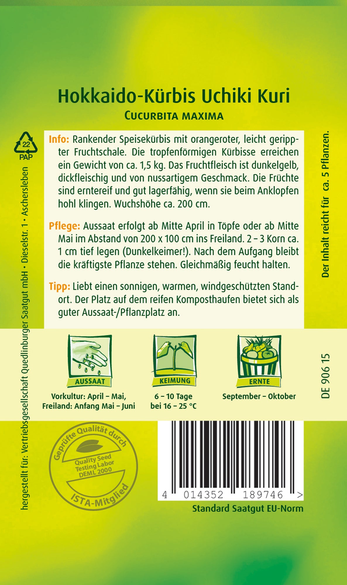 Pflege: Aussaat erfolgt ab Mitte April in Töpfe oder ab Mitte Mai im Abstand von 200 x 100 cm ins Freiland. 2 – 3 Korn ca. 1 cm tief legen (Dunkelkeimer!). Nach dem Aufgang bleibt die kräftigste Pflanze stehen. Gleichmäßig feucht halten.