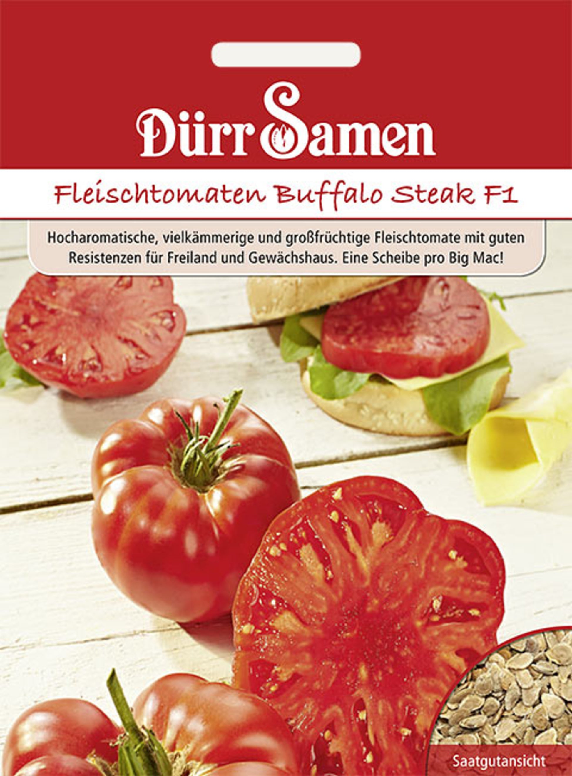 Info: Jumbo-Aroma-Fleischtomaten Buffalo Steak F1 ist eine hocharomatische, vielkämmerige und großfrüchtige Fleischtomate mit guten Resistenzen für Freiland und Gewächshaus. Eine Scheibe pro Big Mac!