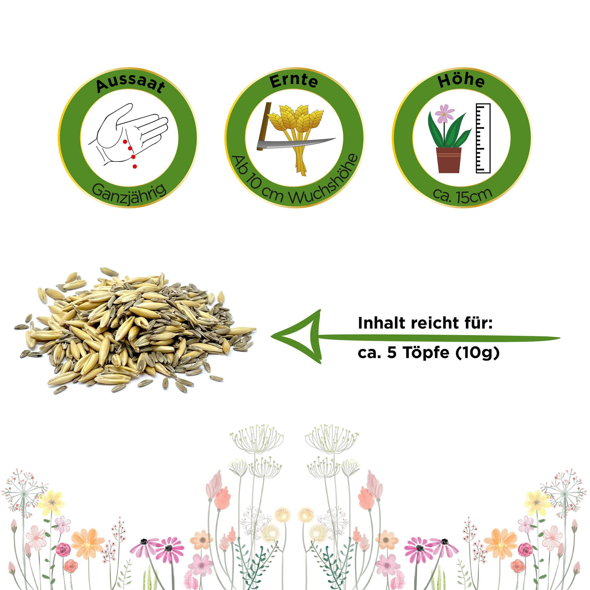 Ernte: Ab 10 cm Wuchshöhe für den Verzehr durch die Katze geeignet.