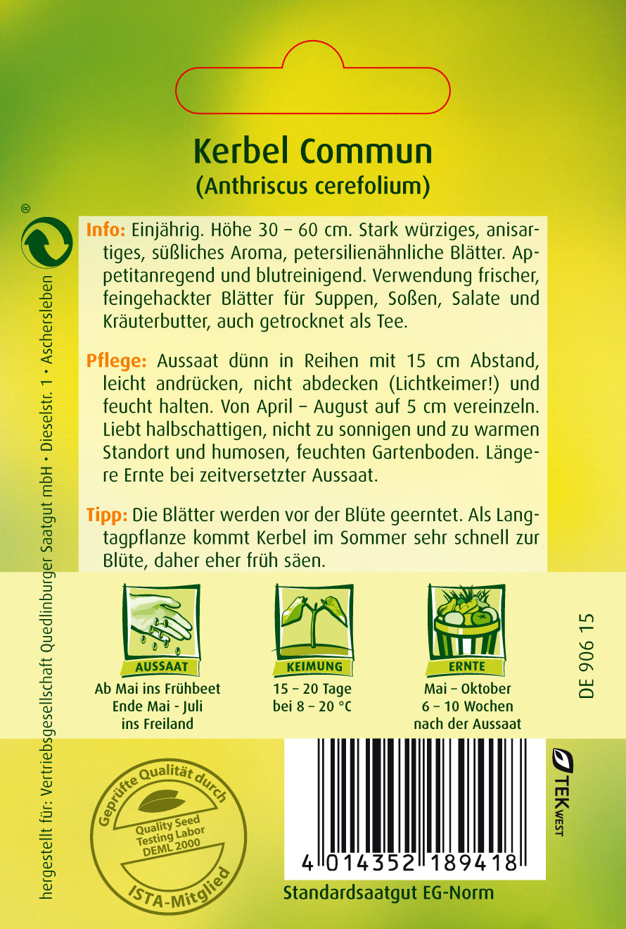 Die Blätter werden vor der Blüte geerntet. Als Langtagpflanze kommt Kerbel im Sommer sehr schnell zur Blüte, daher eher früh säen.