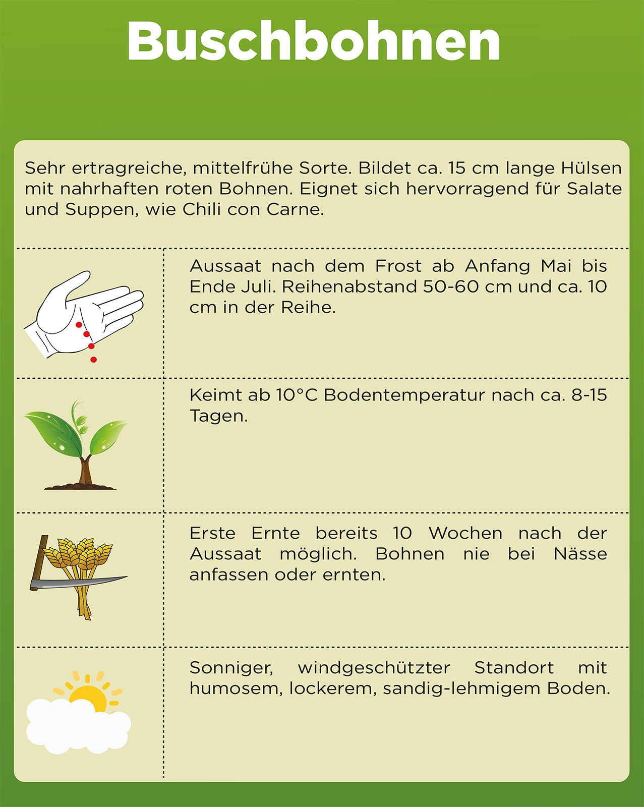 Ernte: Erste Ernte bereits 10 Wochen nach der Aussaat möglich. Bohnen nie bei Nässe anfassen oder ernten.