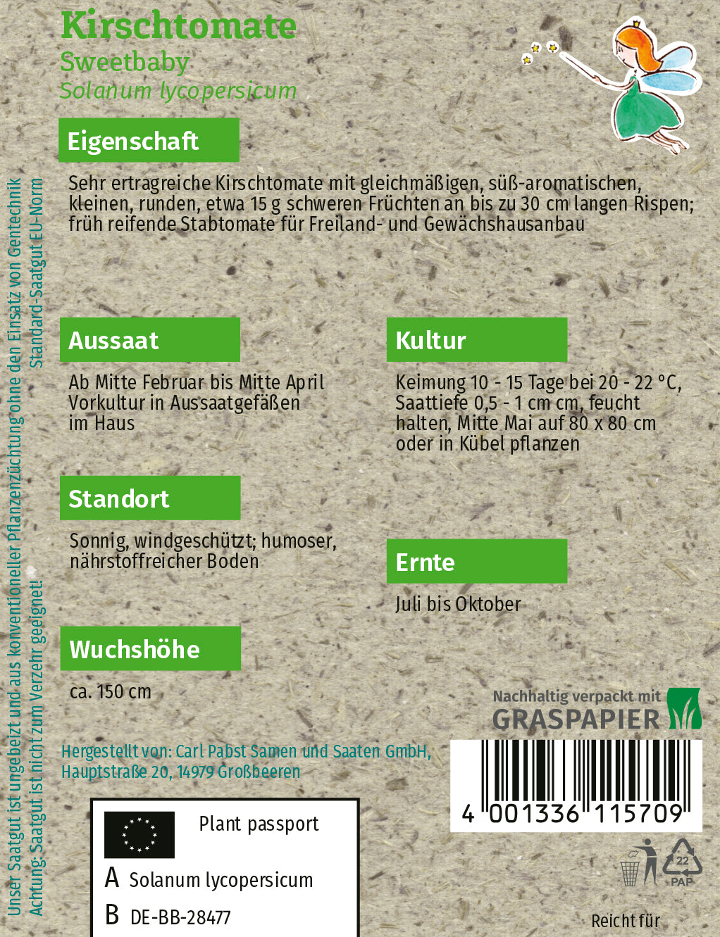 Frühe Stabtomate für Freiland und Gewächshaus, die Kirschtomaten und bildet bis zu 30 cm lange Rispen mit gleichmäßigen, süß-aromatischen, kleinen, runden Früchten.