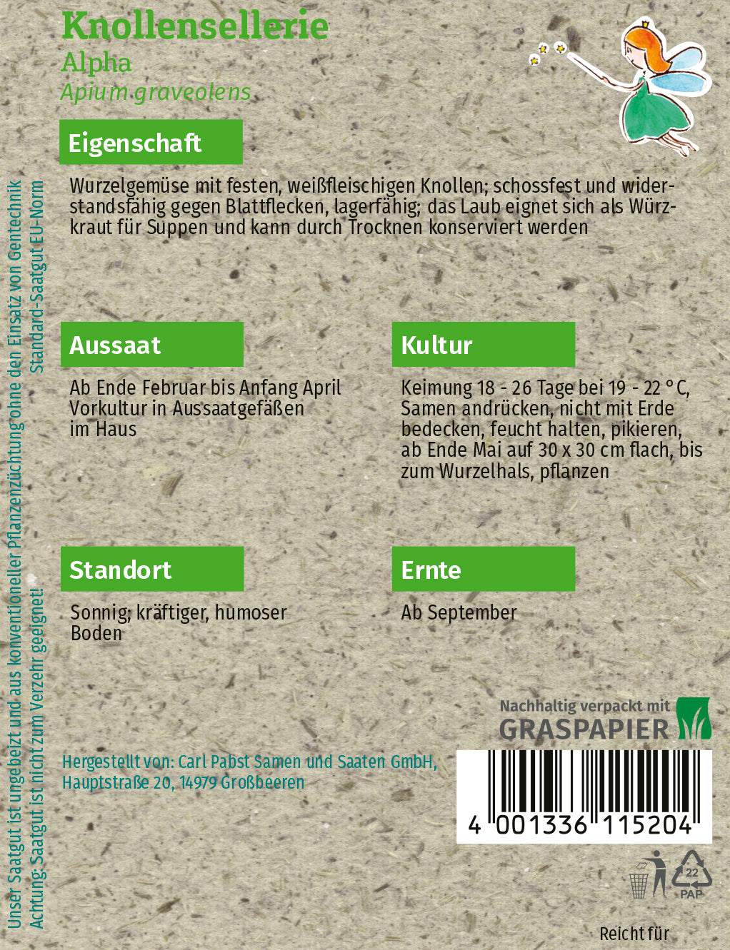 Kultur: Keimung 18-26 Tage bei 19-22 °C, Samen andrücken, nicht mit Erde bedecken, feucht halten, pikieren, ab Ende Mai auf 30x30 cm flach, bis zum Wurzelhals, pflanzen.