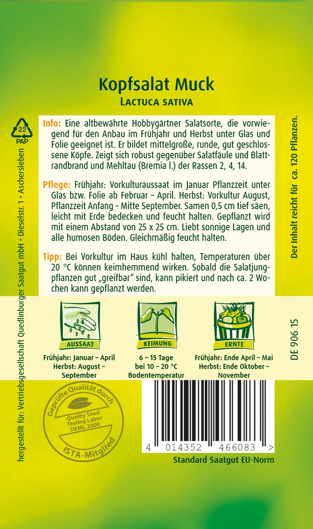 Pflege: Frühjahr: Vorkulturaussaat im Januar Pflanzzeit unter Glas bzw. Folie ab Februar – April. Herbst: Vorkultur im Haus kühl halten, Temperaturen über 20 °C können keimhemmend wirken. Sobald die Salatjungpflanzen gut „greifbar“ sind, kann pikiert und nach ca. 2 Wochen kann gepflanzt werden.