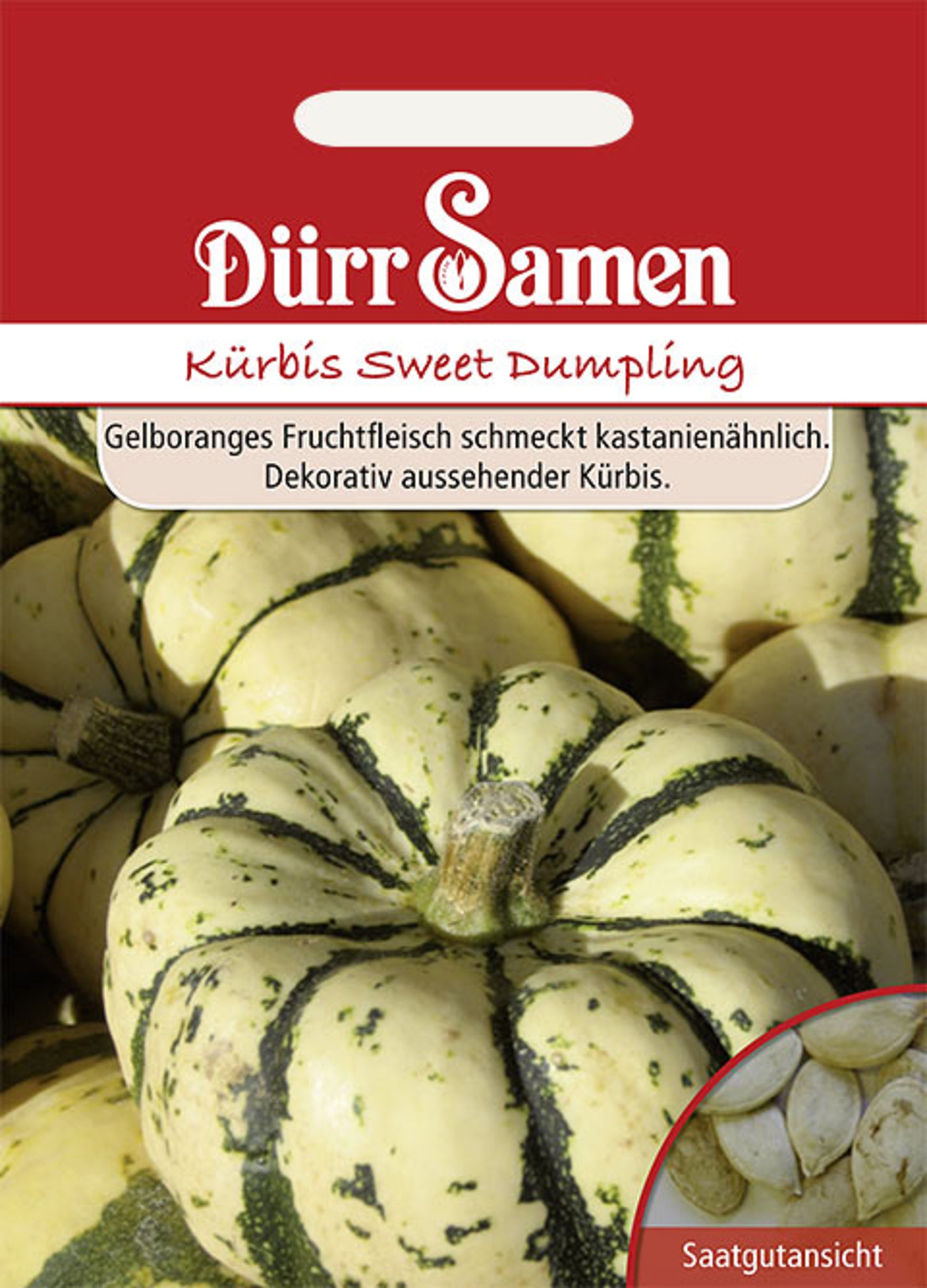Info: Sweet Dumpling ist dekorativ aussehend mit cremeweißem Grund und dunkelgrünen Streifen. Sein gelboranges Fruchtfleisch schmeckt kastanienähnlich.