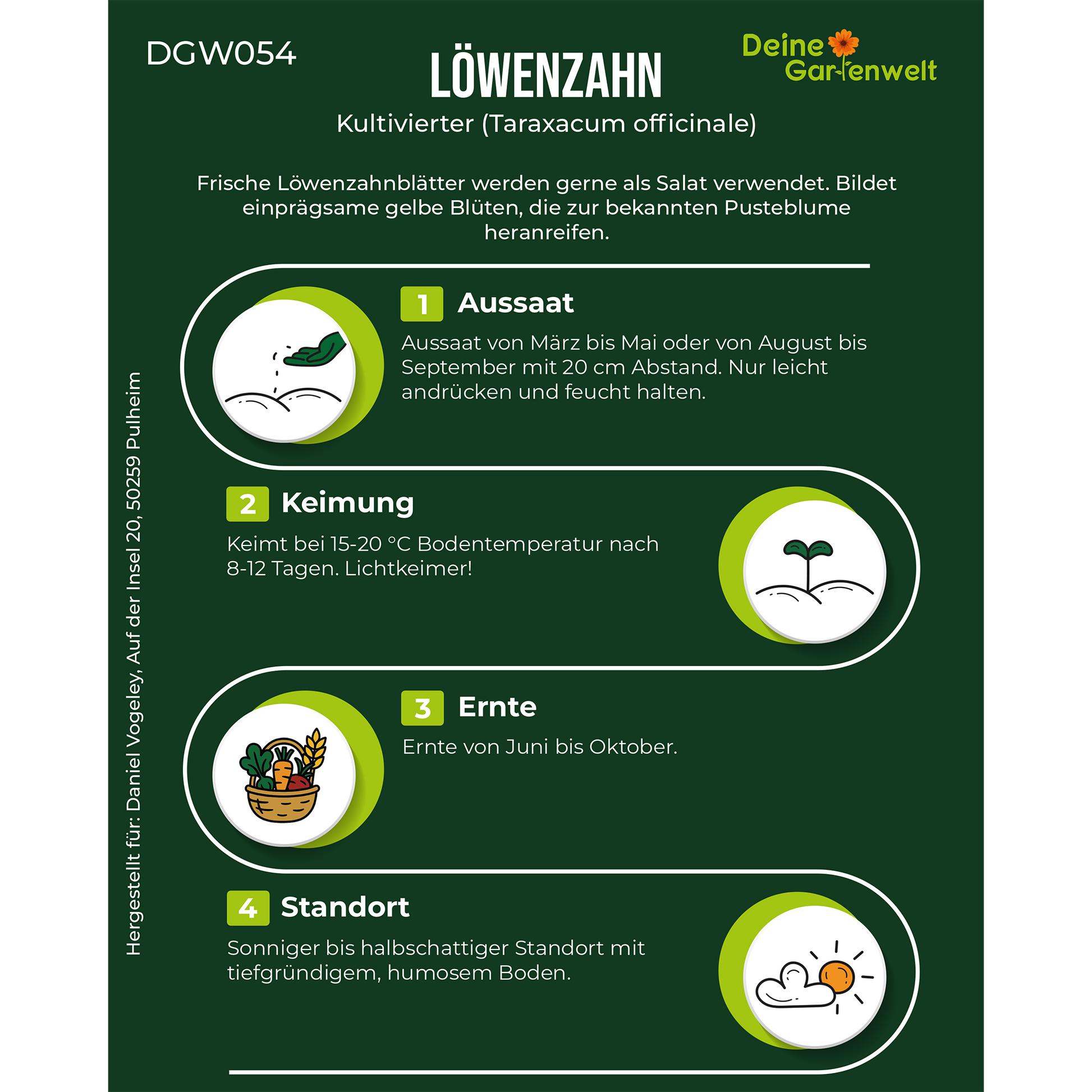 Frische Löwenzahnblätter werden gerne als Salat verwendet. Bildet einprägsame gelbe Blüten, die zur bekannten Pusteblume heranreifen.