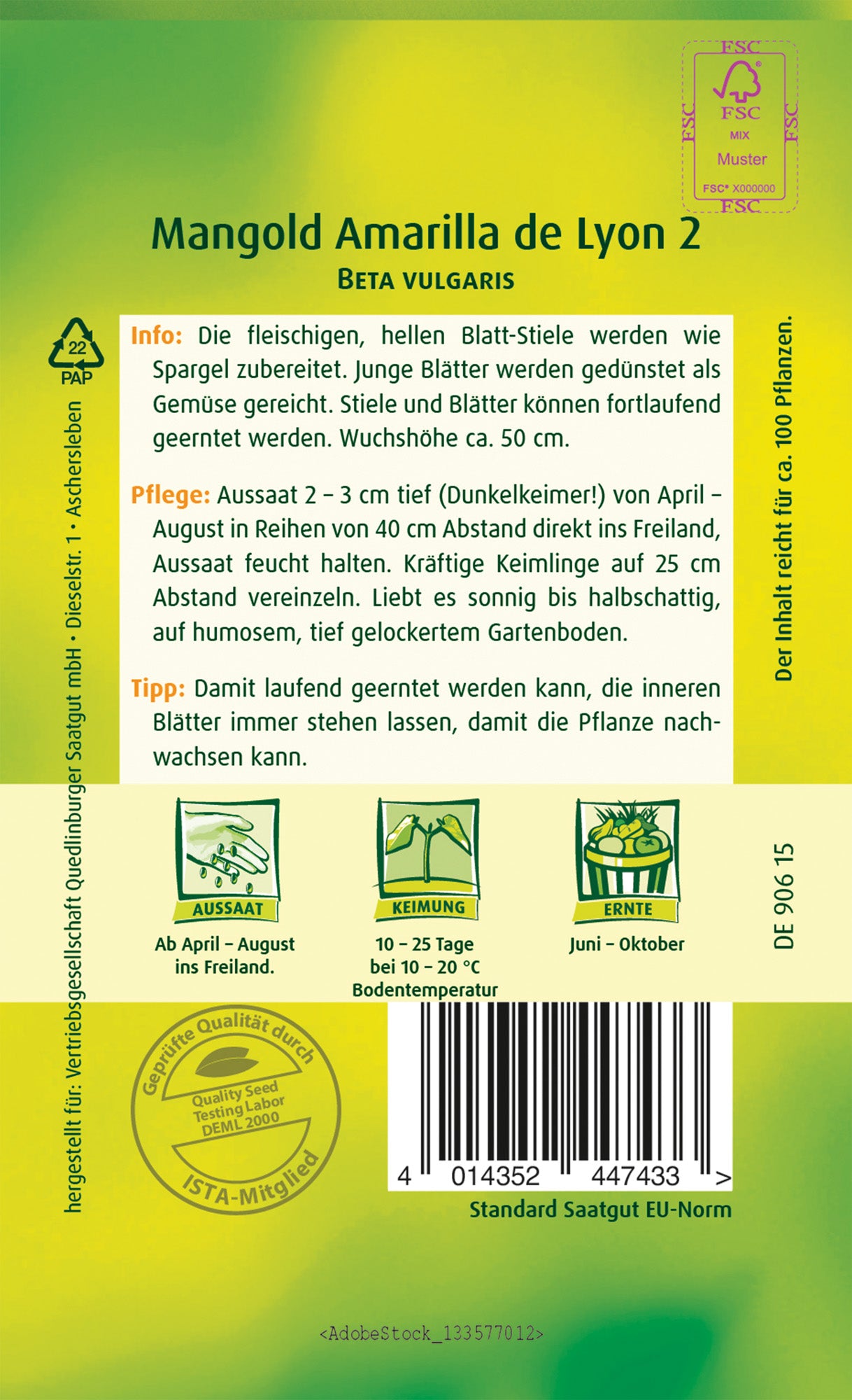 Pflege: Aussaat 2 – 3 cm tief (Dunkelkeimer!) von April – August in Reihen von 40 cm Abstand direkt ins Freiland, Aussaat feucht halten. Kräftige Keimlinge auf 25 cm Abstand vereinzeln. Liebt es sonnig bis halbschattig, auf humosem, tief gelockertem Gartenboden.