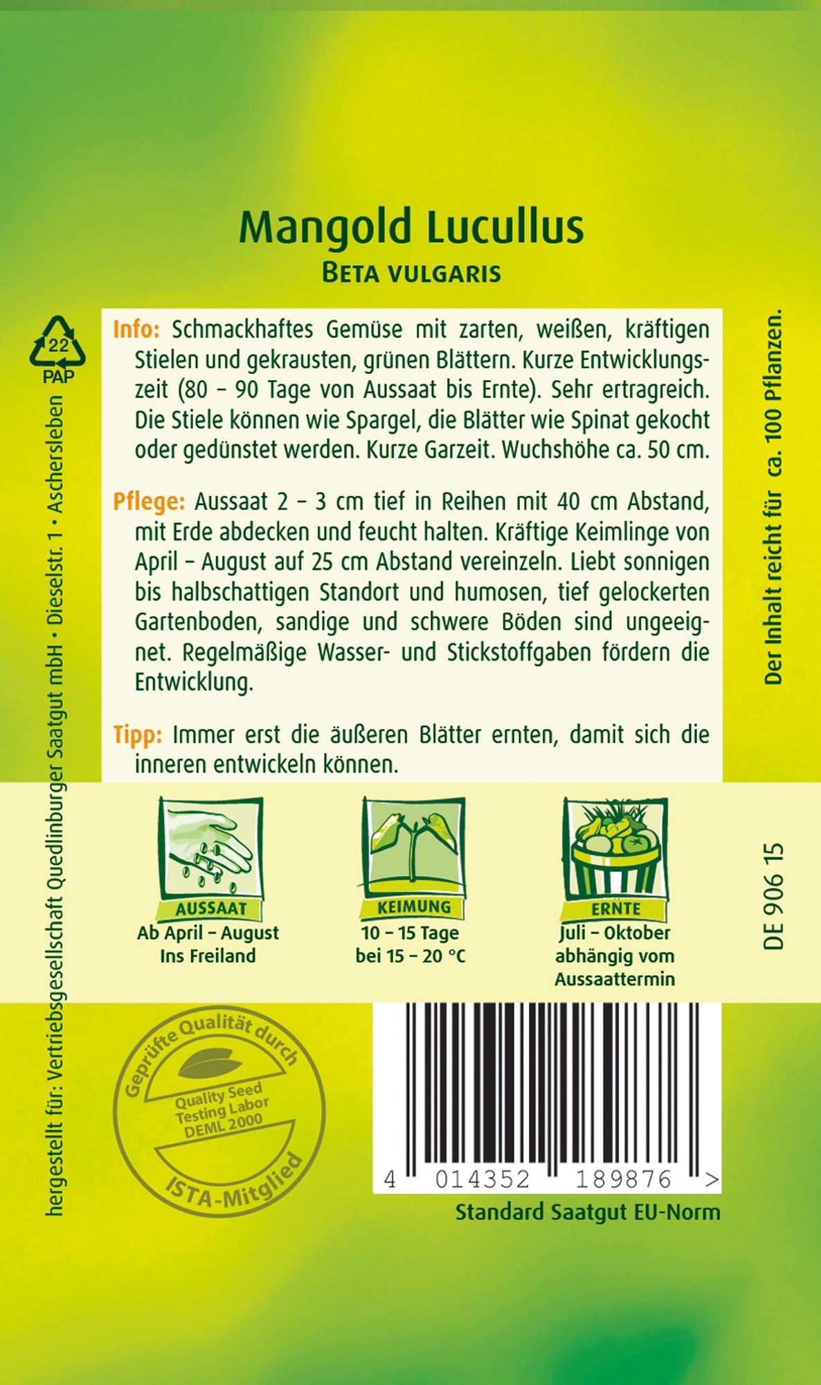 Pflege: Aussaat 2 – 3 cm tief in Reihen mit 40 cm Abstand, mit Erde abdecken und feucht halten. Kräftige Keimlinge von April – August auf 25 cm Abstand vereinzeln. Liebt sonnigen bis halbschattigen Standort und humosen, tief gelockerten Gartenboden, sandige und schwere Böden sind ungeeignet. Regelmäßige Wasser- und Stickstoffgaben fördern die Entwicklung.