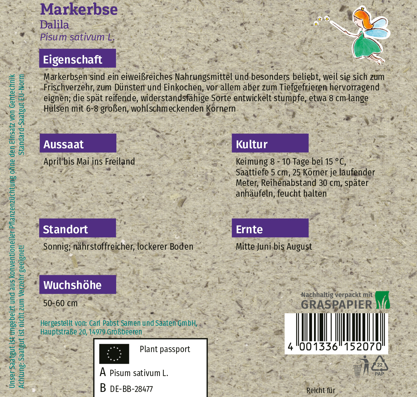 Markerbsen sind ein eiweißreiches Nahrungsmittel undbesonders beliebt, weil sie sich zum Frischverzehr, zum Dünsten und Einkochen, vor allem aber zum Tiefgefrieren hervorragend eignen, die spät reifende, widerstandsfähige Sorte entwickelt stumpfe, etwa 8 cm lange Hülsen mit 6-8 großen, wohlschmeckenden Körnern.