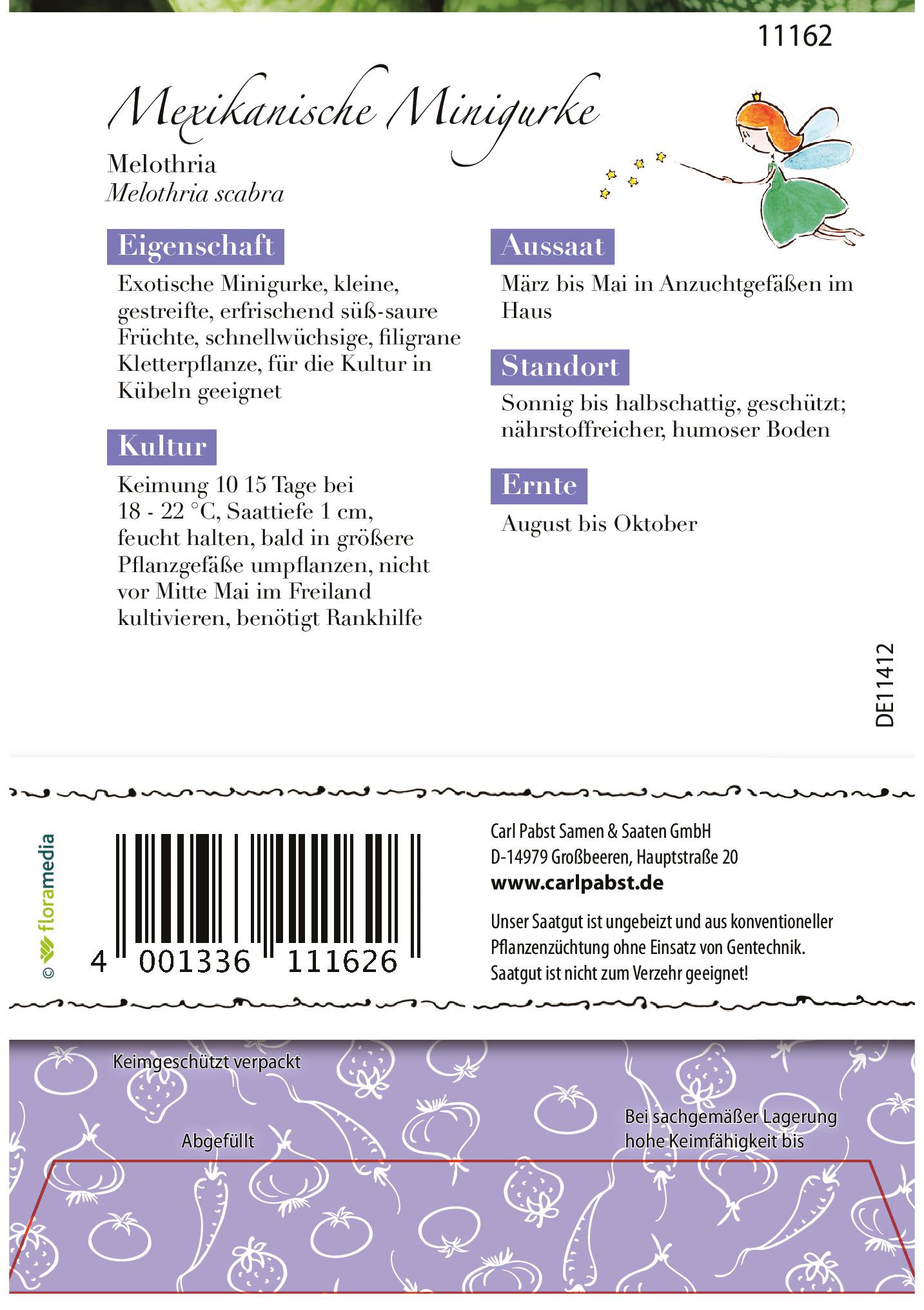 Mehrjähriges, raschwüchsiges, exotisches Kürbisgewächs mit filigranen Ranken erklimmt schnell Kletterhilfen aller Art. Die 2-3 cm großen, gestreiften, erfrischend süß-sauren Früchte erinnern optisch an kleine Wassermelonen. Sie passen roh in Salate, können aber auch sauer eingelegt werden. Eine frostfreie Überwinterung der Wurzelknollen ist möglich.