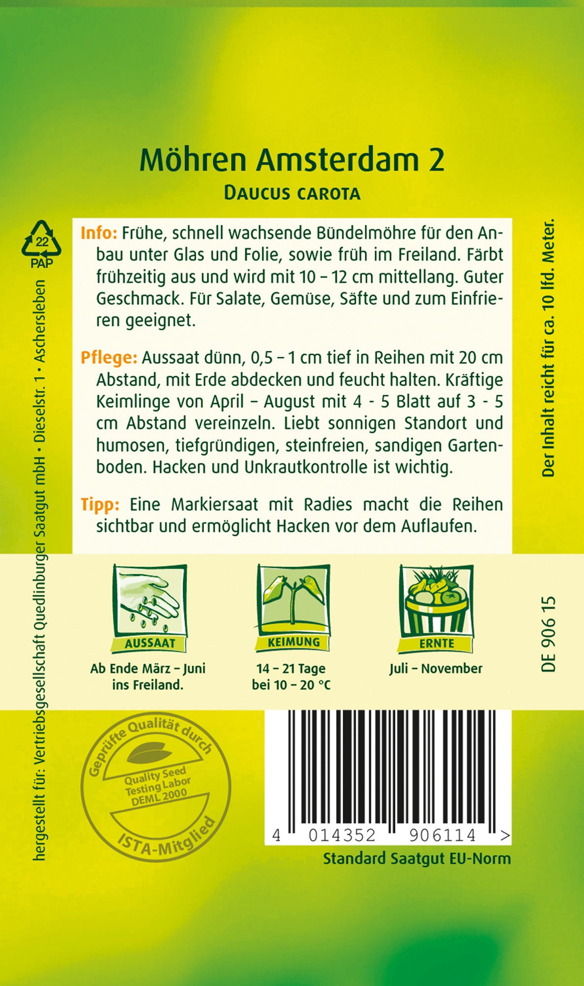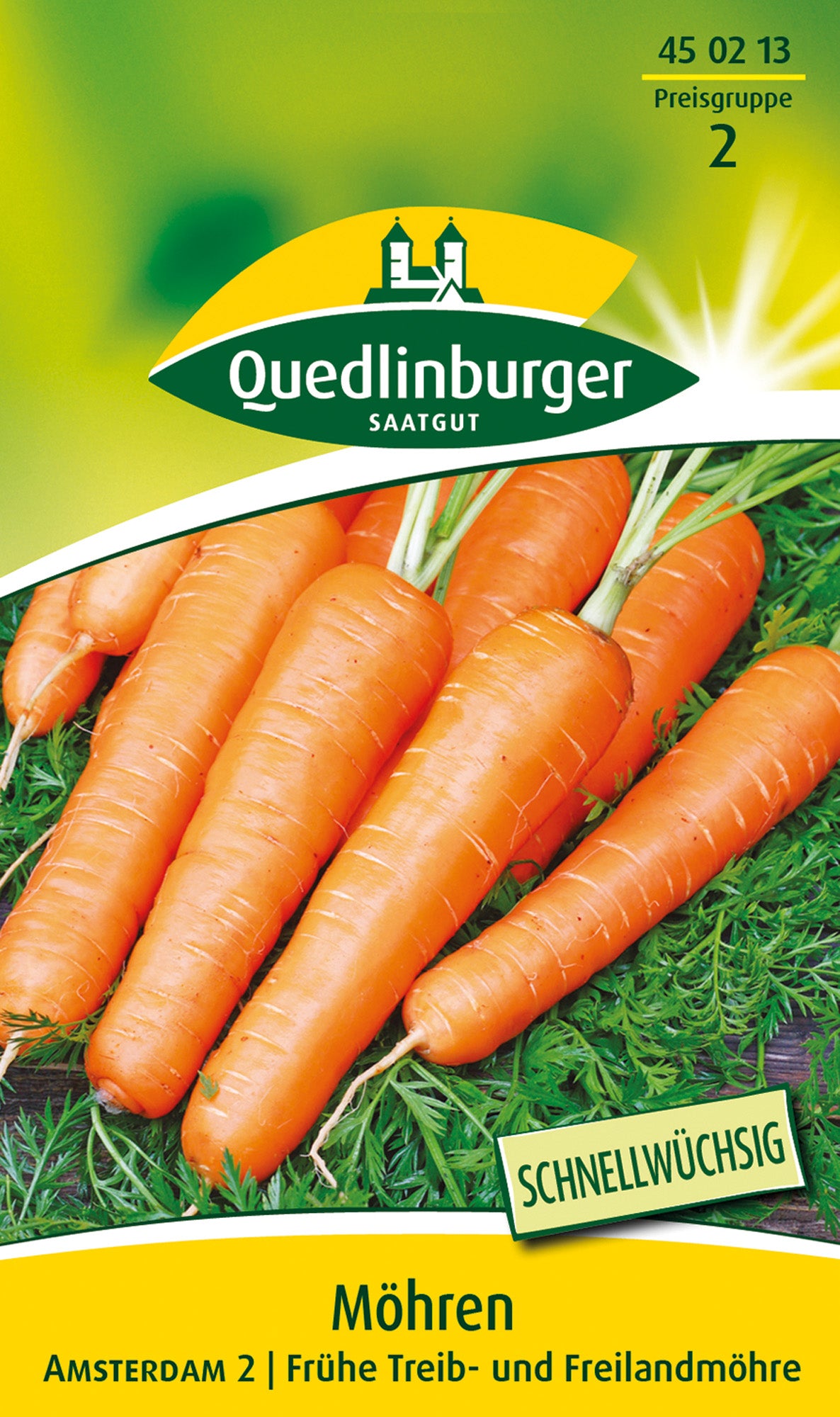 Frühe, schnell wachsende Bündelmöhre für den Anbau unter Glas und Folie, sowie früh im Freiland. Färnt frühzeitig aus und wird mit 10 - 12 cm mittellang. Guter Geschmack. Für Salate, Gemüse, Säfte und zum Einfrieren geeignet.