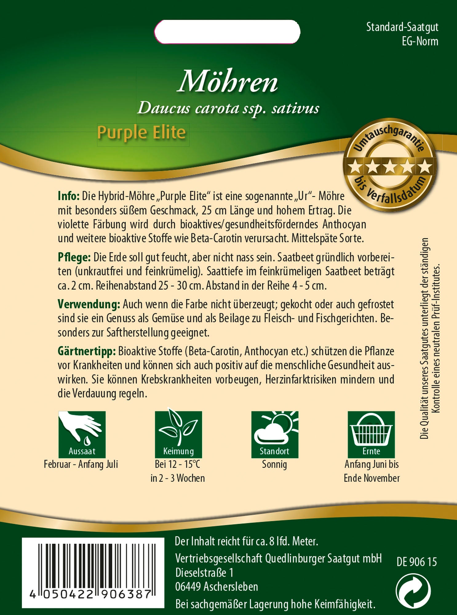 Info: Die Hybrid-Möhre „Purple Elite“ ist eine sogenannte „Ur“- Möhre mit besonders süßem Geschmack, 25 cm Länge und hohem Ertrag. Die violette Färbung wird durch bioaktives/gesundheitsförderndes Anthocyan und weitere bioaktive Stoffe wie Beta-Carotin verursacht. Mittelspäte Sorte.