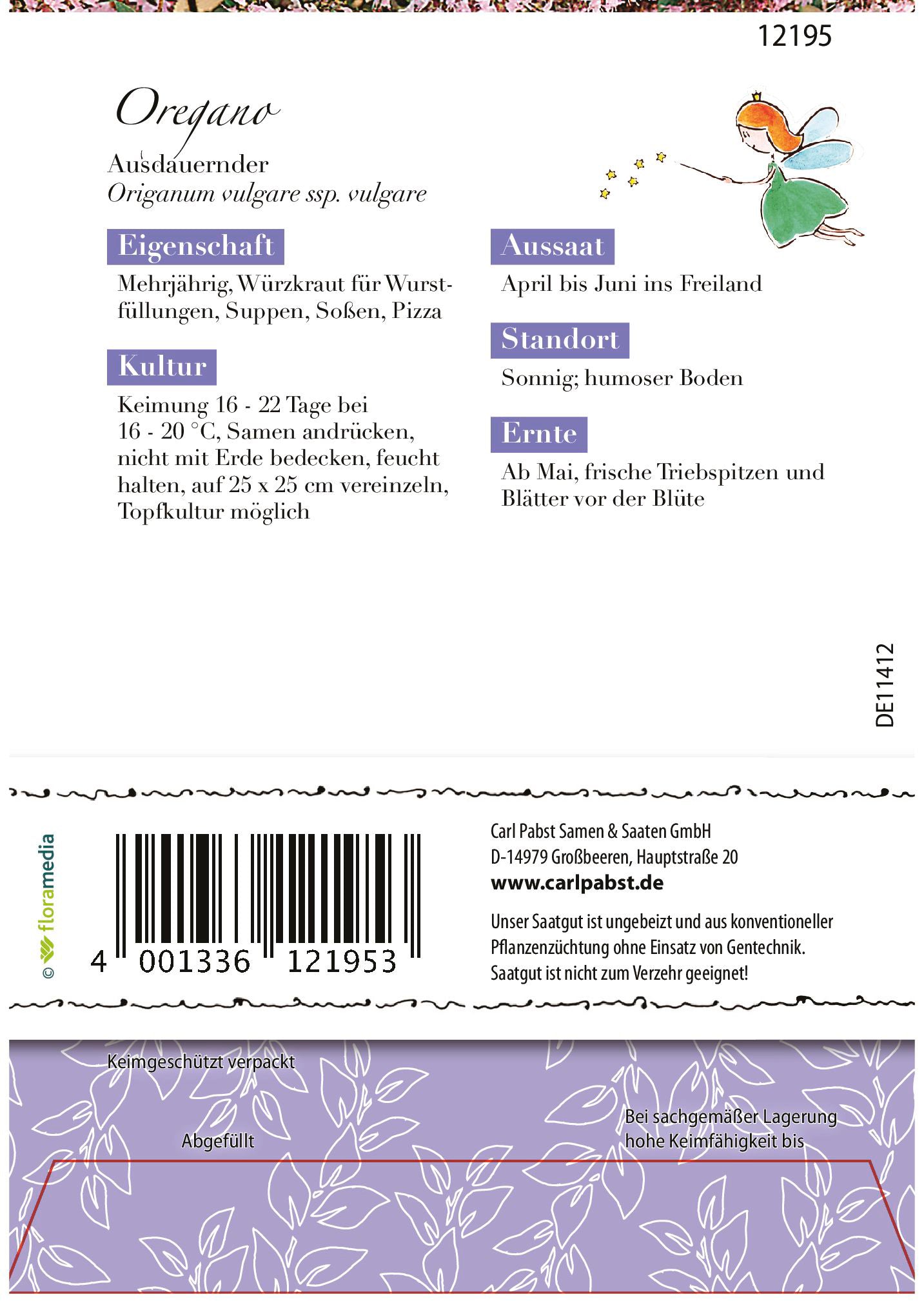 Mehrjähriges Würzkraut mit dekorativen, bei Nützlingen beliebten Blüten. Oregano kann frisch und getrocknet für Wurstfüllungen, Suppen, Soßen, Pizza verwendet werden. Am aromatischsten ist das Kraut kurz nach dem Blühen, hilft als Heilpflanze bei Erkältung und Verdauungsbeschwerden.