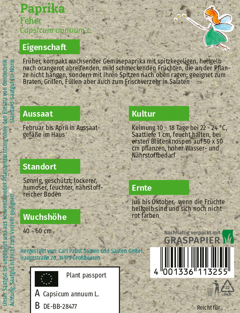Früher, kompakt wachsender Gemüsepaprika mit spitzkegeligen, hellgelb nach orangerot abreifenden, mild schmeckenden Früchten, die an der Pflanze nicht hängen, sondern mit ihren Spitzen nach oben ragen, geeignet zum Braten, Grillen, Füllen aber auch zum Frischverzehr in Salaten.