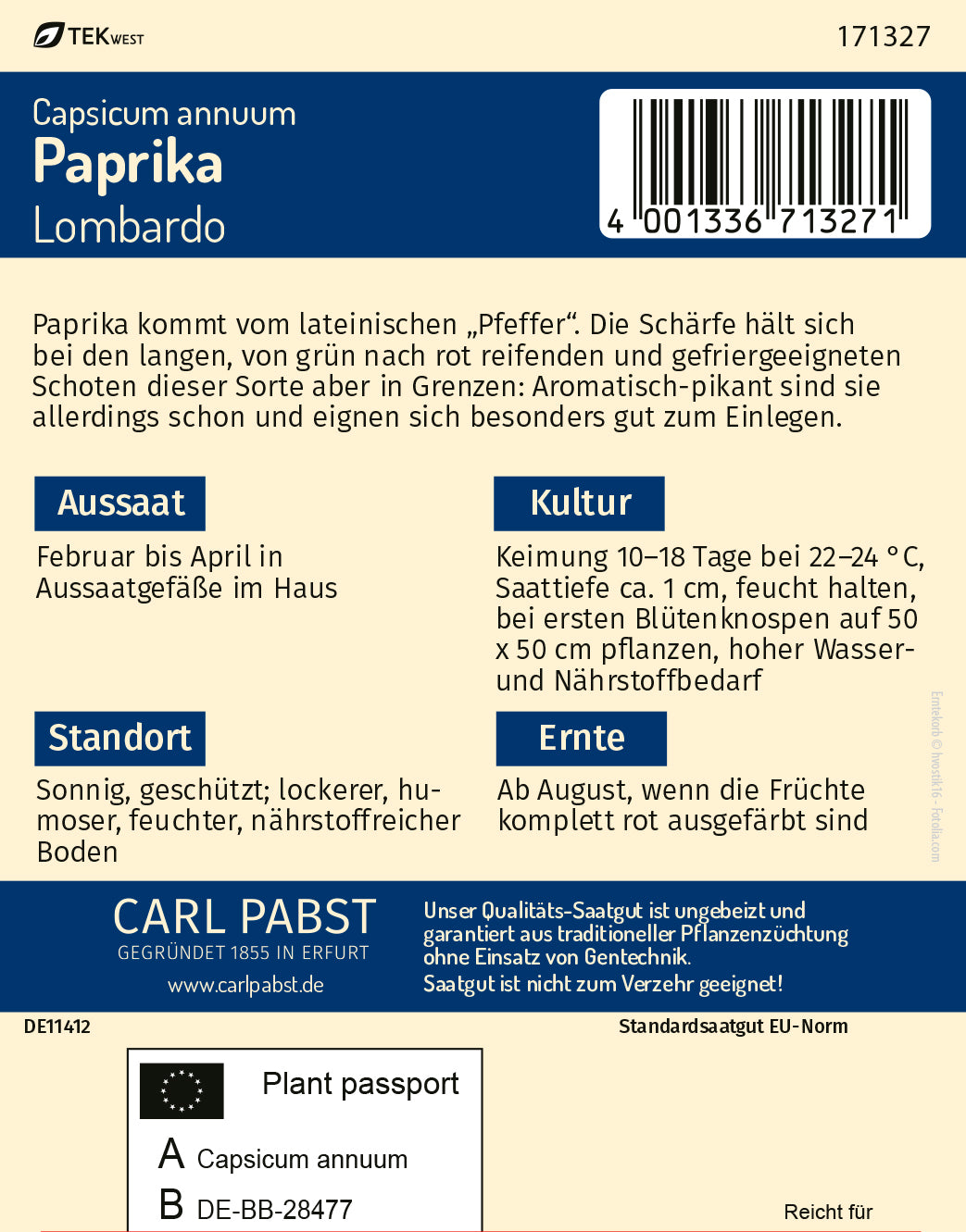 Italienische Traditionssorte von grün nach rot reifender, mild-aromatischer Peperoni mit nur leichter Schärfe, der Spiralpaprika entwickelt früh etwa 15 cm lange und 2 cm breite Früchte, die sich besonders gut zum Einlegen eignen.