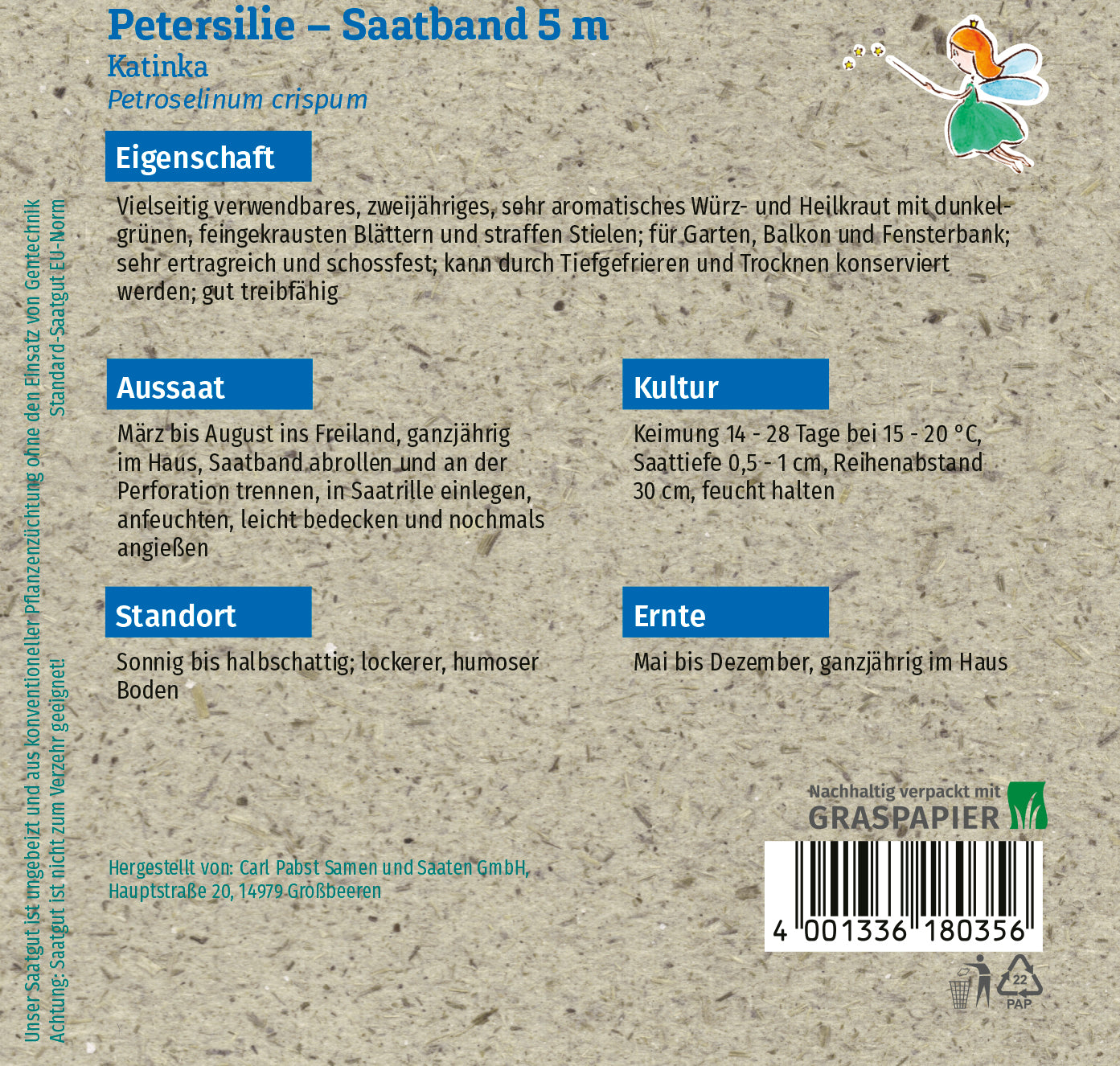 Aussaat: März bis August ins Freiland, ganzjährig im Haus, Saatband abrollen und an der Perforation trennen, in Saatrille einlegen, anfeuchten, leicht bedecken und nochmals angießen.