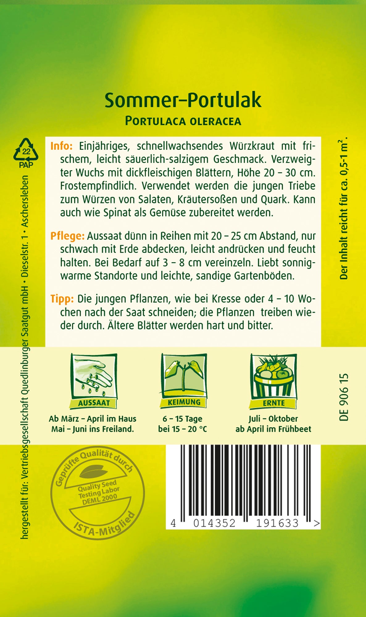 Aussaat dünn in Reihen mit 20 – 25 cm Abstand, nur schwach mit Erde abdecken, leicht andrücken und feucht halten. Bei Bedarf auf 3 – 8 cm vereinzeln. Liebt sonnig-warme Standorte und leichte, sandige Gartenböden.