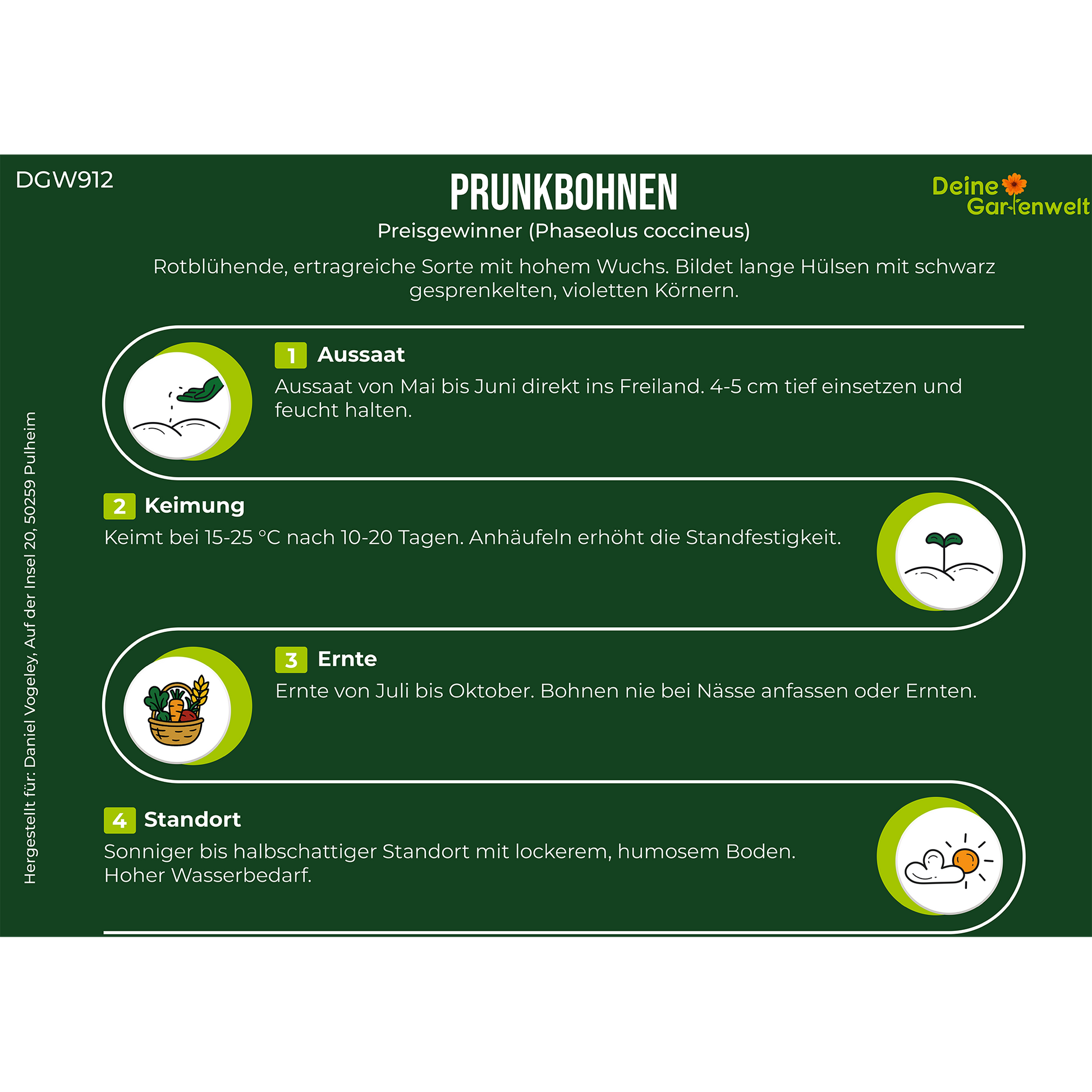 Rotblühende, ertragreiche Sorte mit hohem Wuchs. Bildet lange Hülsen mit schwarz gesprenkelten, violetten Körnern.