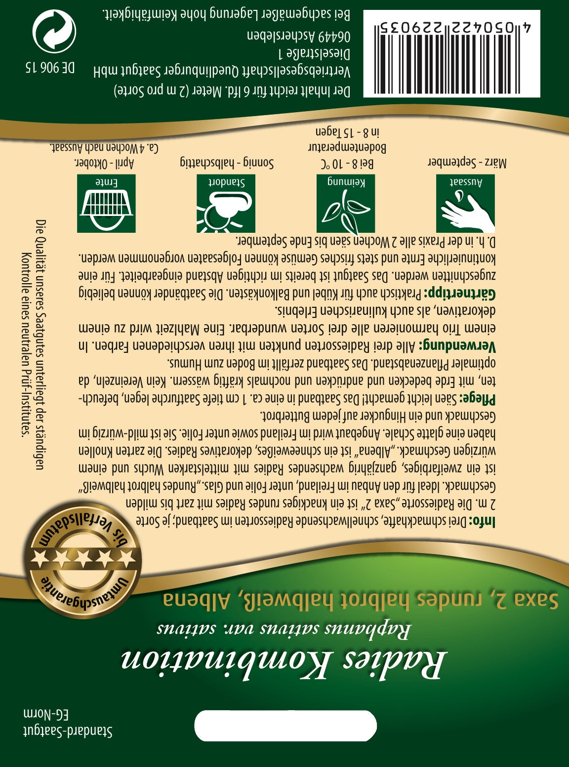 Drei schmackhafte, schnellwachsende Radiessorten im Saatband. Je Sorte 2 m. Die Radiessorte "Saxa 2" ist ein knackiges rundes Radies mit zart bis milden Geschmack. Ideal für den Anbau im Freiland, unter Folie und Glas. "Rundes halbrot halbweiß" ist ein zweifarbiges, ganzjährig wachsendes Radies mit mittelstarken Wuchs und einem würzigen Geschmack. "Albena" ist ein schneeweißes, dekoratives Radies. Die zarten Knollen haben eine glatte Schale. Angebaut wird im Freiland sowie unter Folie. Sie ist mild-würzig im Geschmack und ein Hingucker auf jedem Butterbrot.