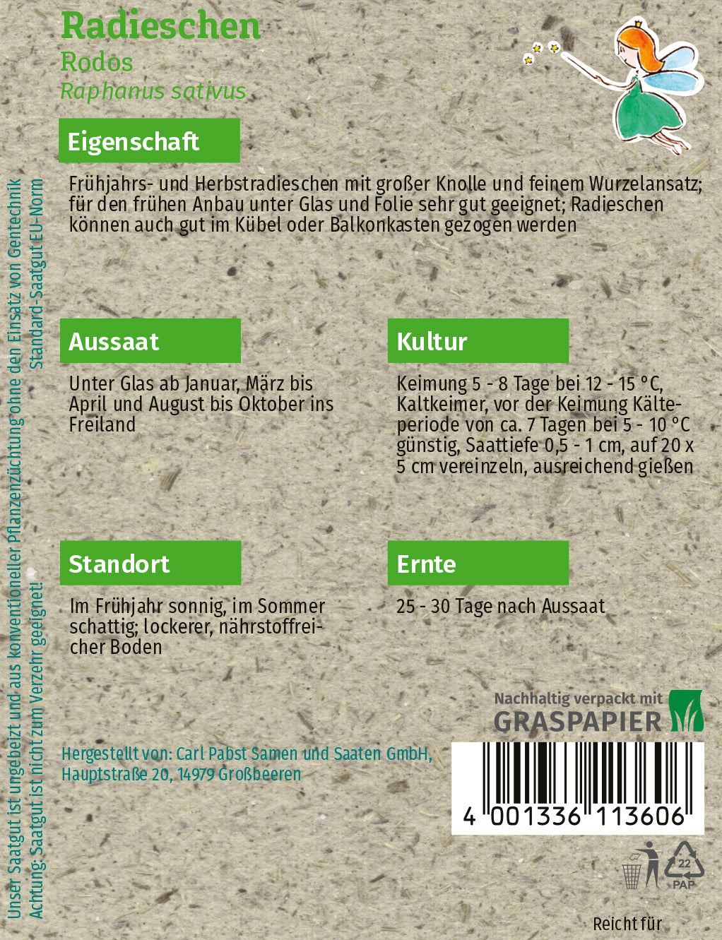 Frühjahrs- und Herbstradieschen mit großer Knolle und feinem Wurzelansatz, für den frühen Anbau unter Glas und Folie sehr gut geeignet, Radieschen können auch gut im Kübel oder Balkonkasten gezogen werden.