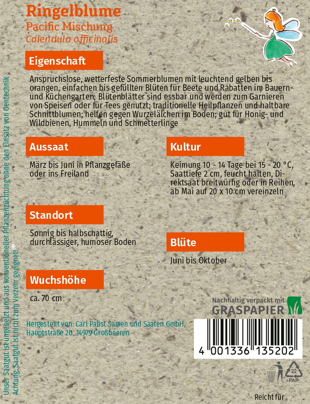 Anspruchslose, wetterfeste Sommerblumen mit leuchtend gelben bis orangen, einfachen bis gefüllten Blüten für Beete und Rabatten im Bauern- und Küchengarten. Die Blütenblätter sind essbar und werden zum Garnieren von Speisen oder für Tees genutzt. Ringelblumen sind traditionelle Heilpflanzen und haltbare Schnittblumen, sie helfen gegen Nematoden im Boden und sind gut für Honig- und Wildbienen, Hummeln und Schmetterlinge.
