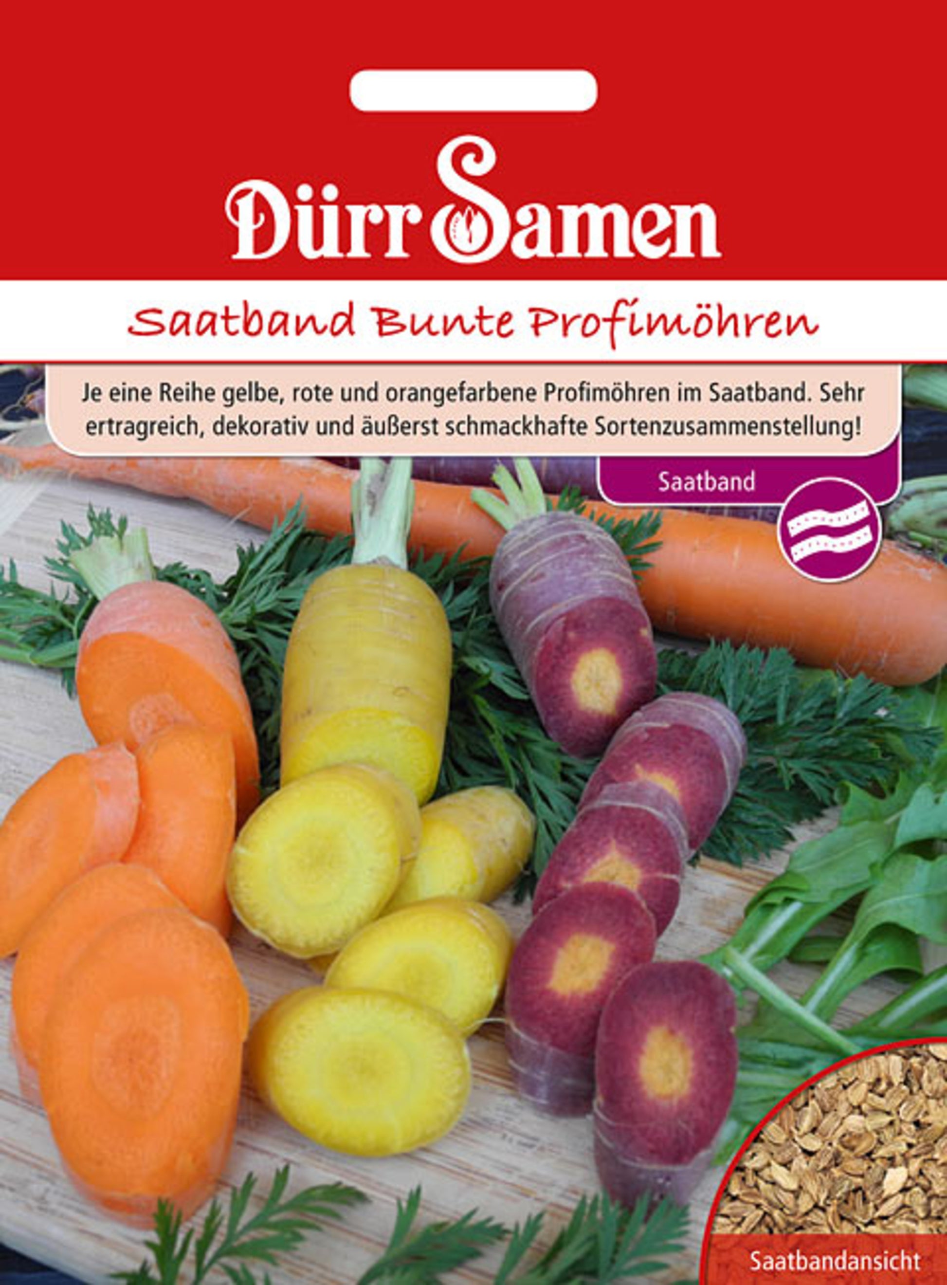 Info: Je eine Reihe gelbe, rote und orangefarbene Profimöhren im Saatband. Sehr ertragreich, dekorativ und äußerst schmackhafte Sortenzusammenstellung!