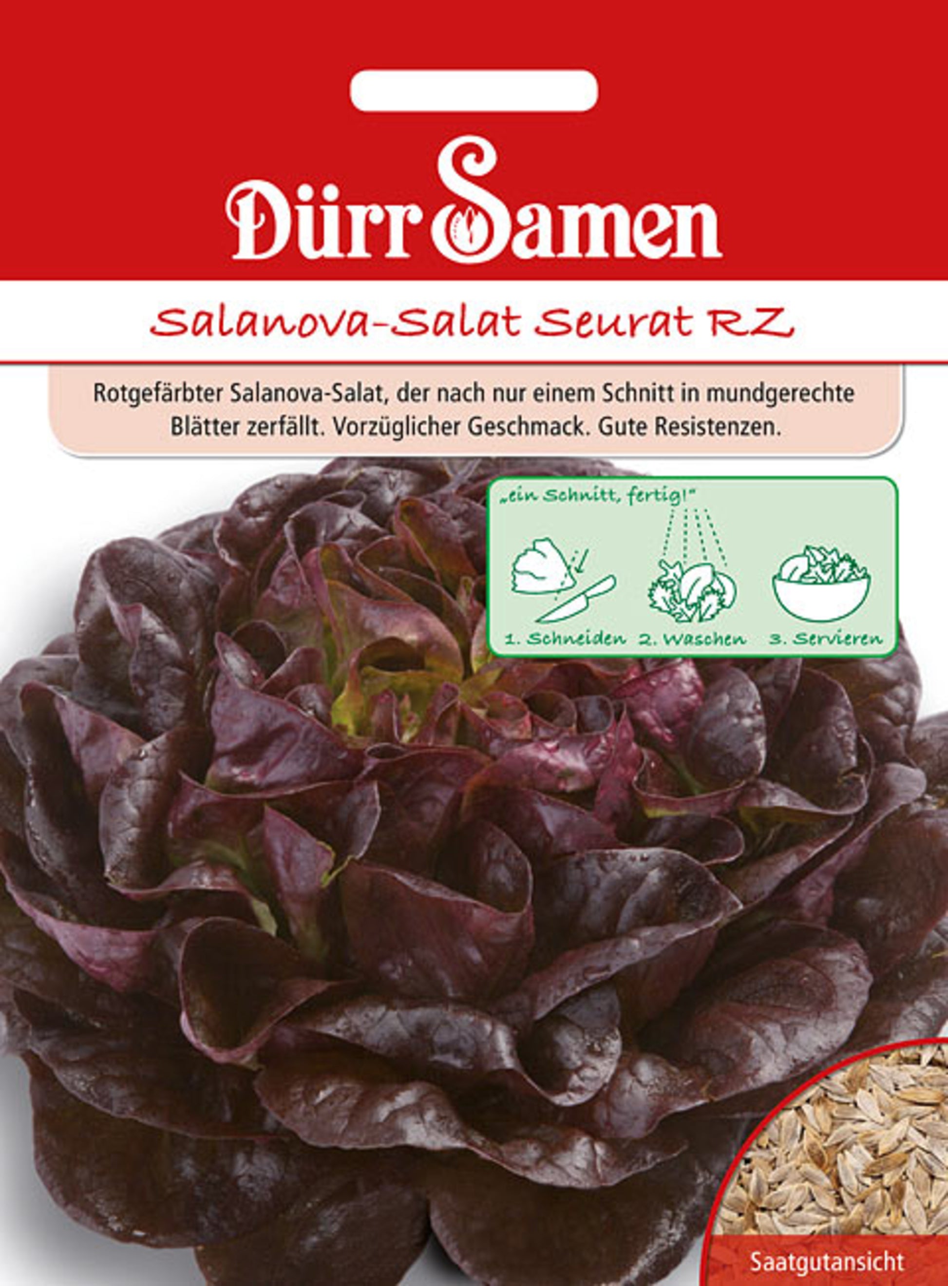 Info: Seurat RZ ist ein rotgefärbter Salanova-Salat, der nach nur einem Schnitt in mundgerechte Blätter zerfällt. Er hat einen vorzüglichen Geschmack und gute Resistenzen.