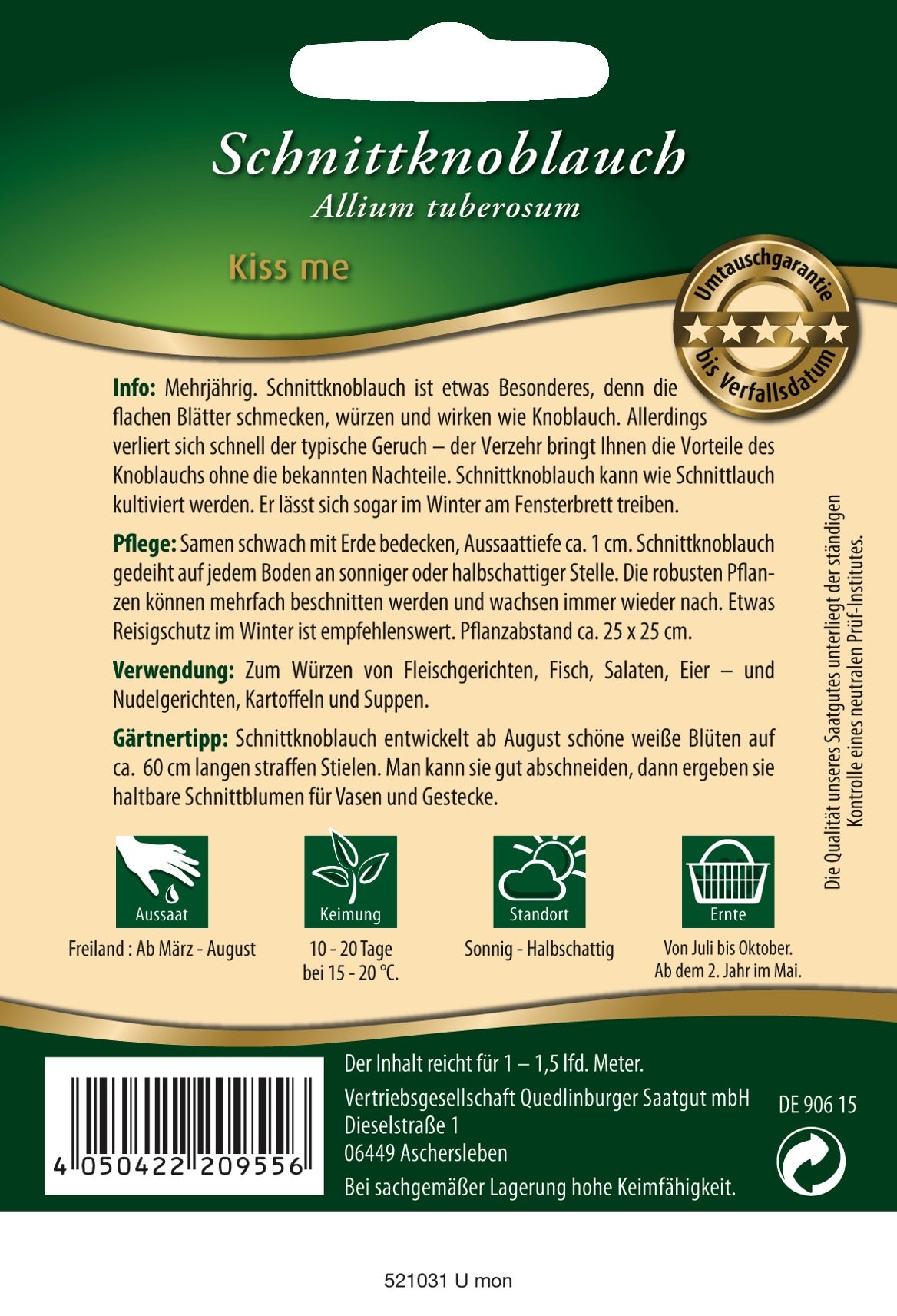 Pflege: Samen schwach mit Erde bedecken, Aussaattiefe ca. 1 cm. Schnittknoblauch gedeiht auf jedem Boden an sonniger oder halbschattiger Stelle. Die robusten Pflanzen können mehrfach beschnitten werden und wachsen immer wieder nach. Etwas Reisigschutz im Winter ist empfehlenswert. Pflanzabstand ca. 25 x 25 cm.