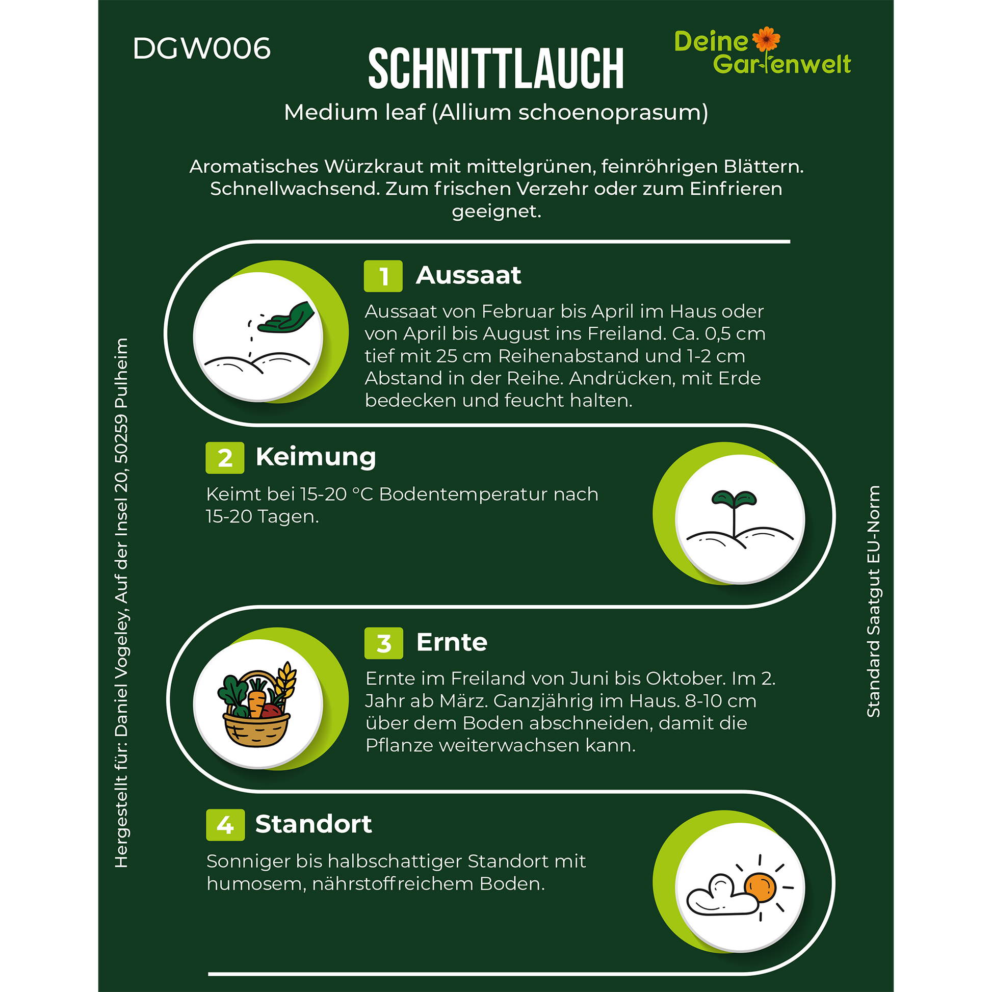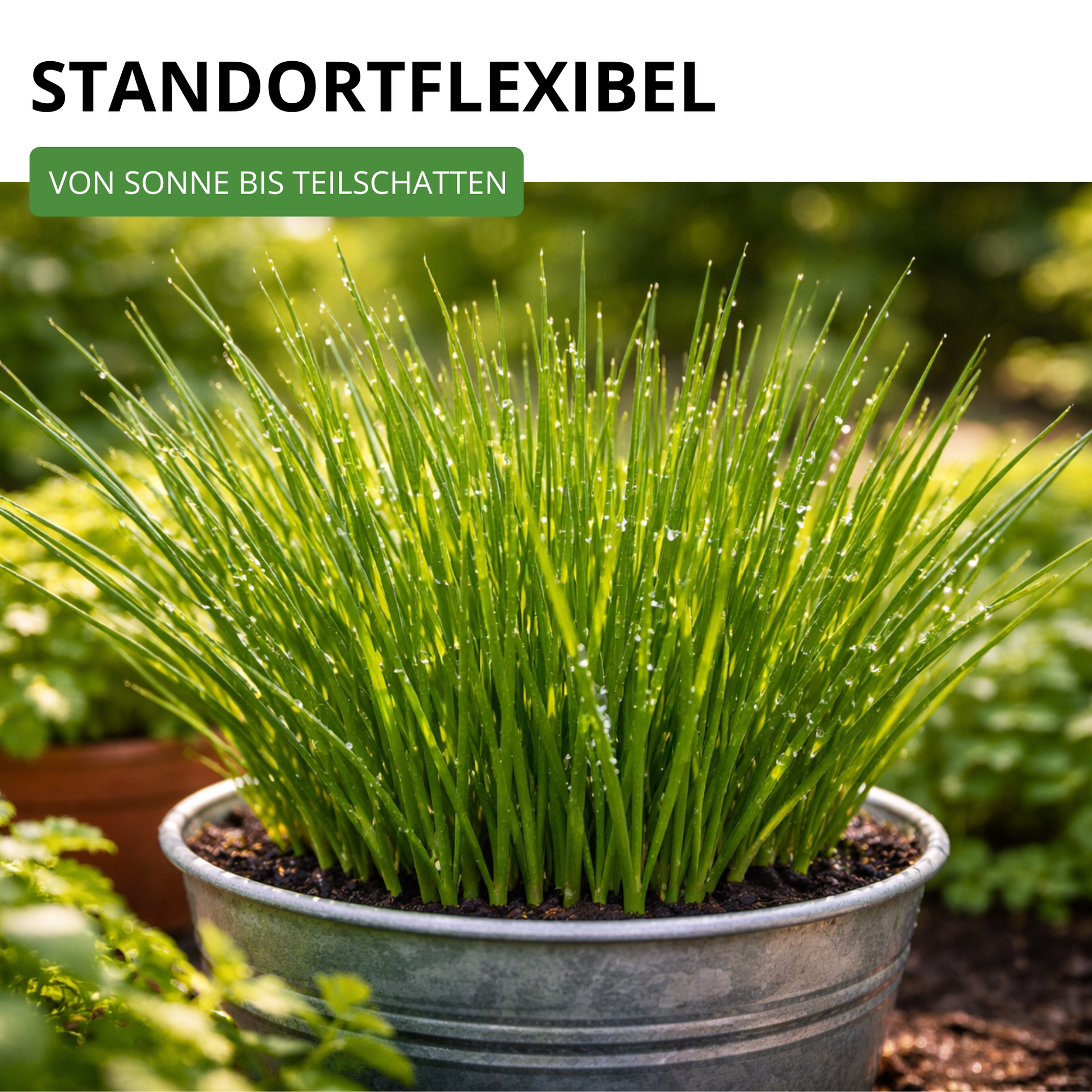 Aromatisches Würzkraut mit mittelgrünen, feinröhrigen Blättern. Schnellwachsend. Zum frischen Verzehr oder zum Einfrieren geeignet.