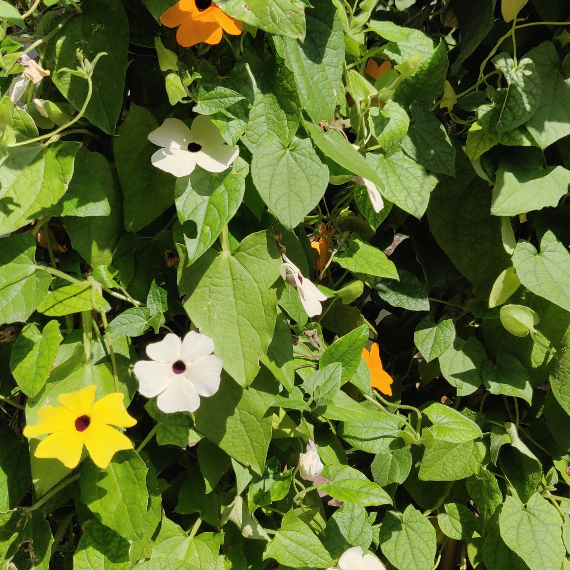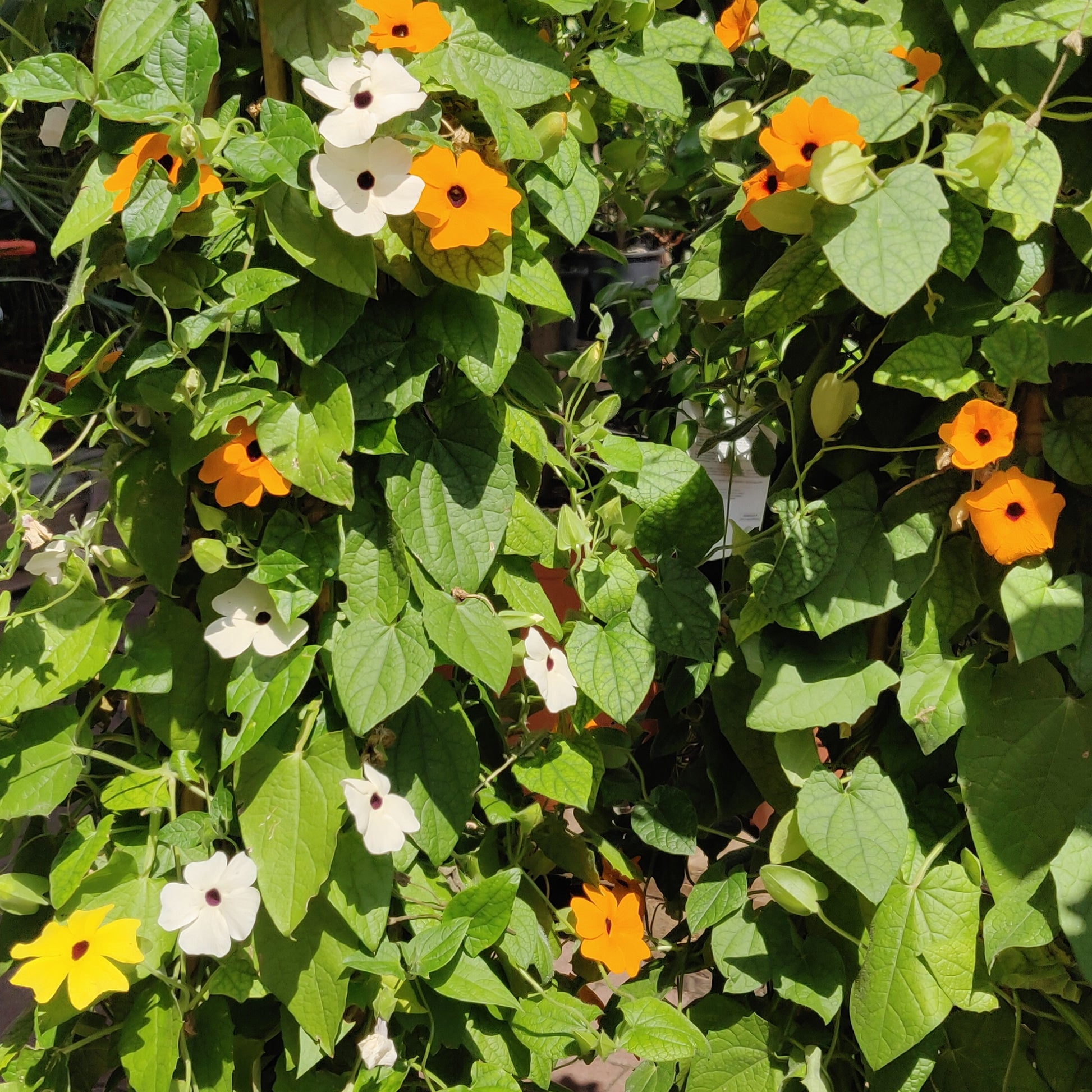 Einjährige Kletterpflanze. Sehr dekorativ. Zarte Pastelltönen mit einem auffälligen schwarzen Auge in jeder Blüte. Wird bis zu 150 cm hoch.