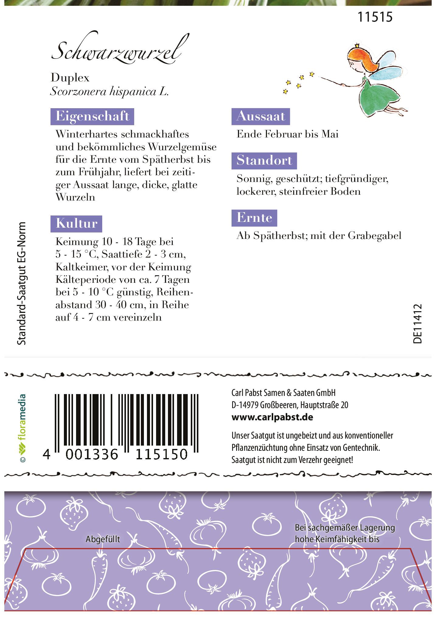 Winterhartes schmackhaftes und bekömmliches Wurzelgemüse für die Ernte vom Spätherbst bis zum Frühjahr, liefert bei zeitiger Aussaat lange, dicke, glatte, unverzweigte Wurzeln mit schwarzer Haut, die über Winter bei Frostfreiheit laufend frisch geerntet werden können, Zubereitung und Verwendung ähnlich wie Spargel.
