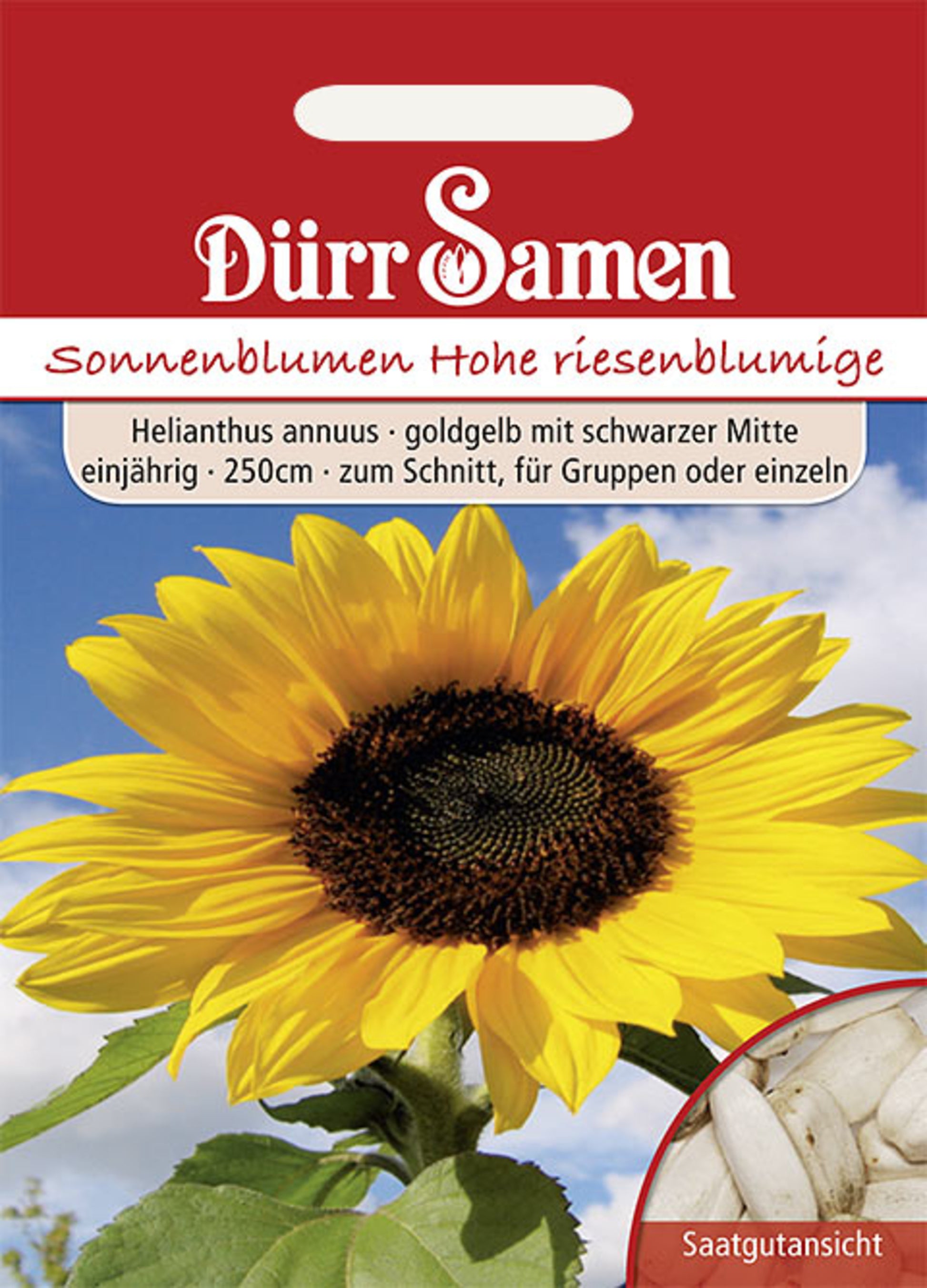 Info: 'Hohe riesenblumige', goldgelbe Sonnenblumen mit schwarzer Mitte.