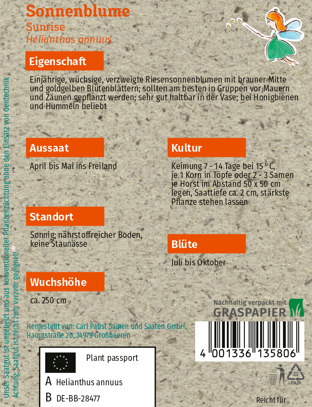 Einjährige, wüchsige, verzweigte Riesensonnenblumen mit brauner Mitte und goldgelben Blütenblättern. Sie sollten am besten in Gruppen vor Mauern und Zäunen gepflanzt werden, sind sehr gut haltbar in der Vase und bei Honigbienen und Hummeln beliebt.